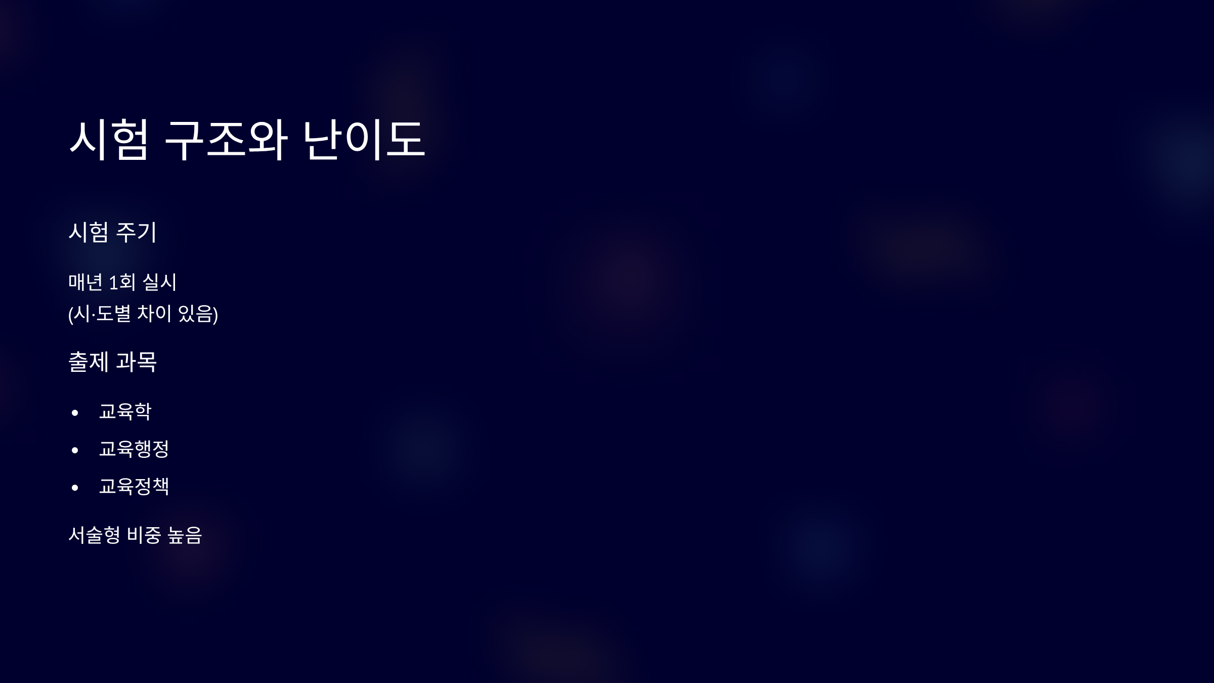 시험 과목은 교육학, 교육행정, 교육정책이 중심입니다.