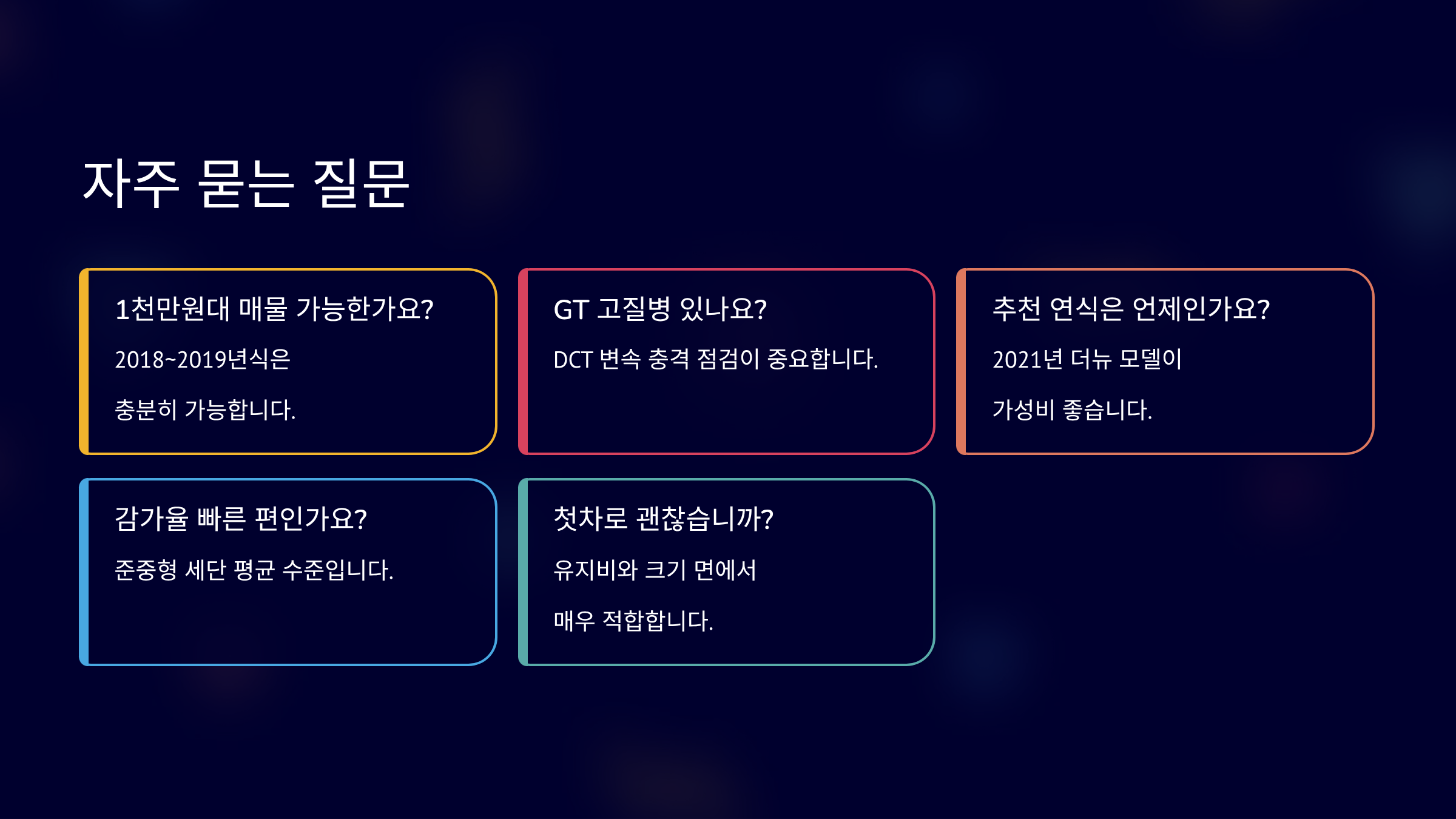 Q. 감가율 빠른 편인가요? A. 준중형 세단 평균 수준입니다.