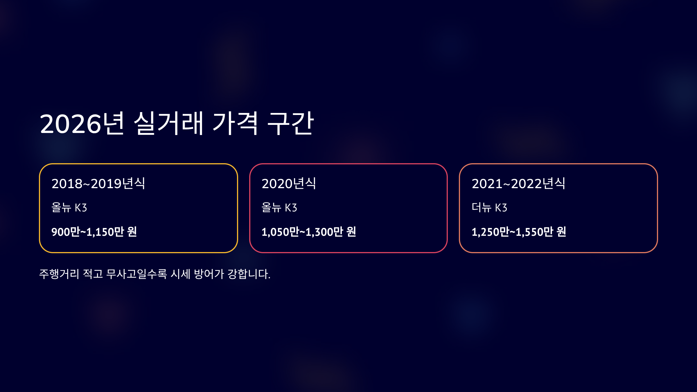 k3 중고차 시세는 연식뿐 아니라 주행거리, 사고이력, GT 여부에 크게 좌우됩니다.