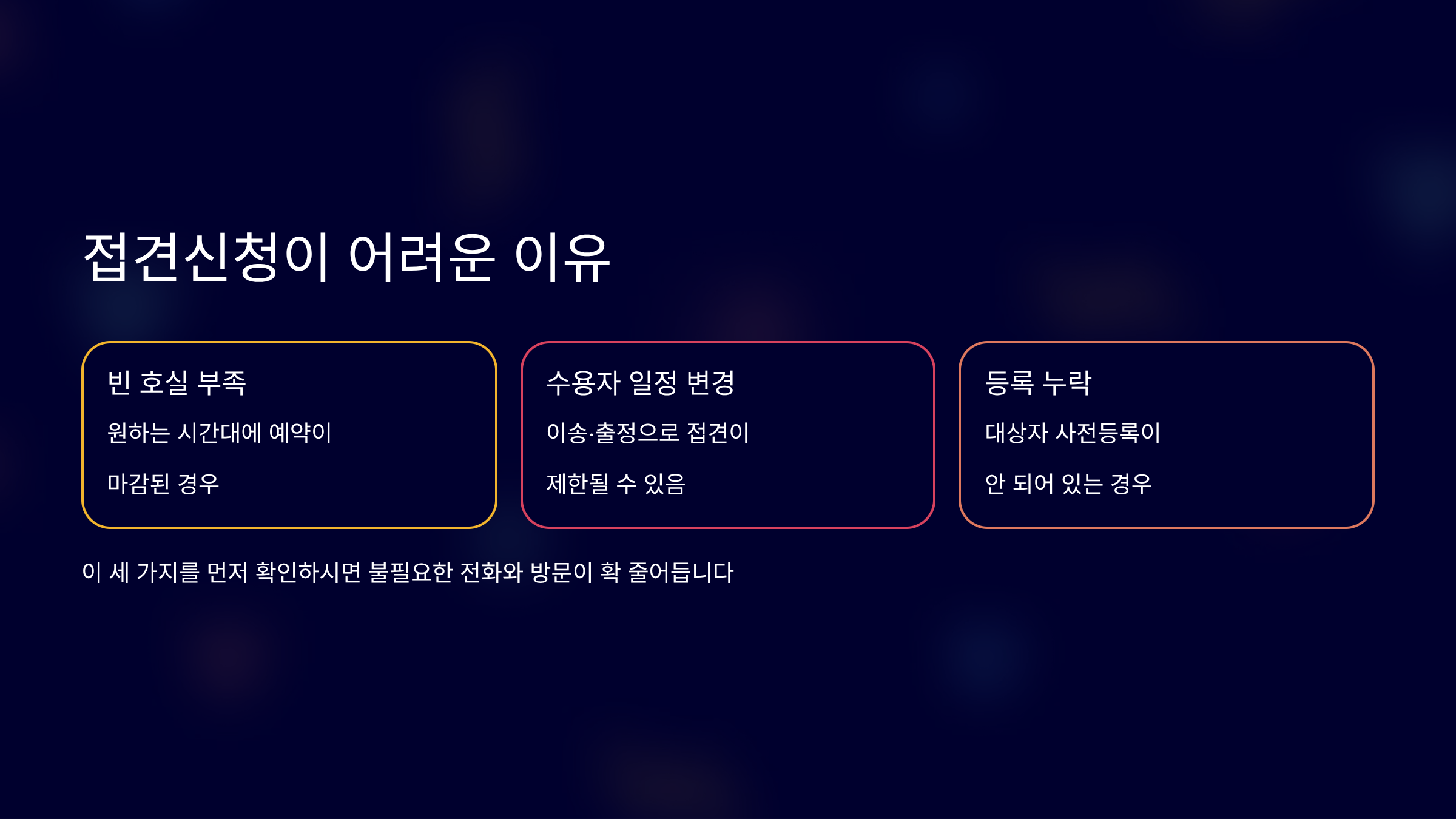 특히 빈 호실, 수용자 일정, 등록 문제 세 가지를 먼저 의심해 보세요.