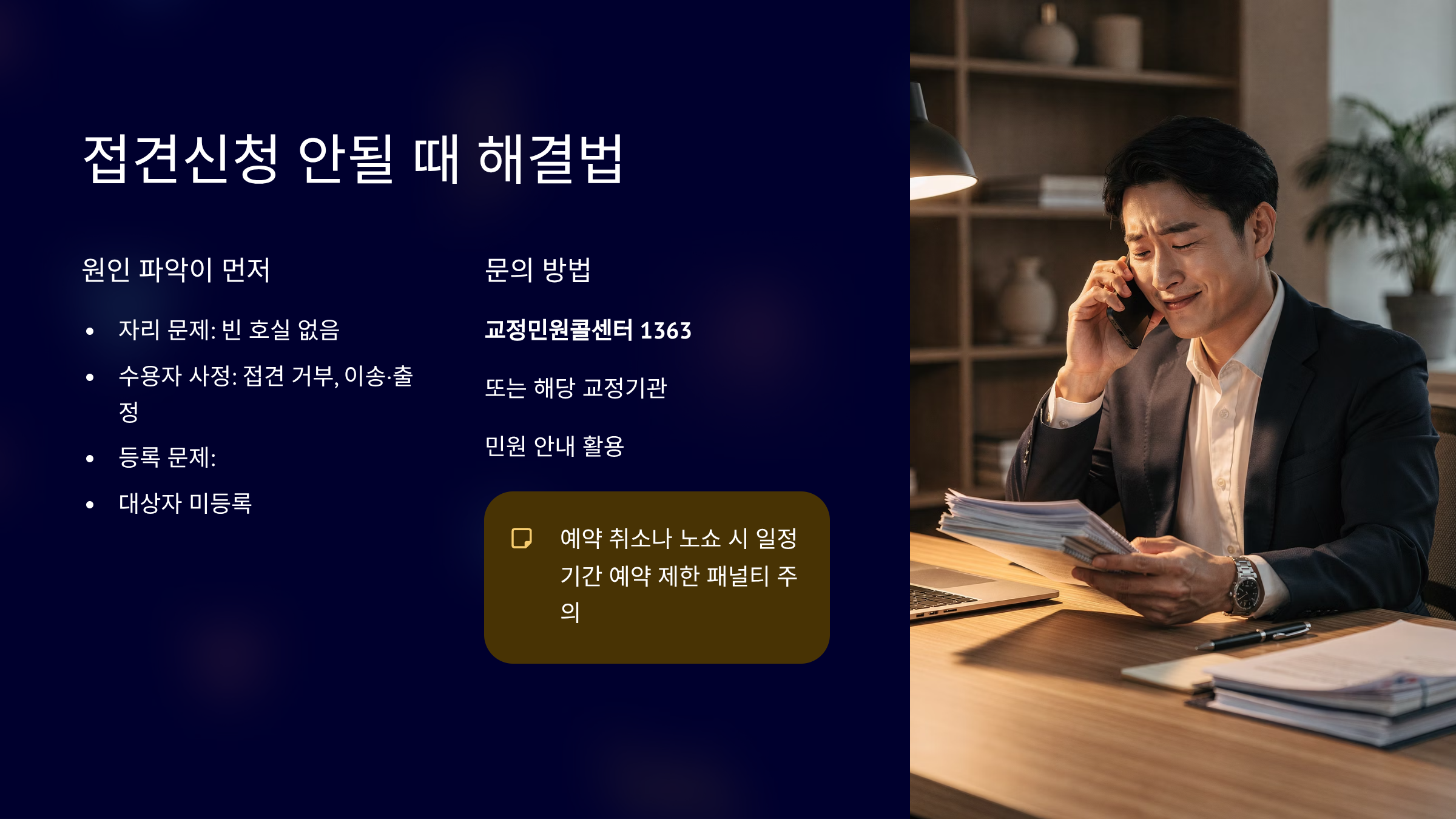 예약은 회차와 접견 호실을 지정해 운영되므로, 희망 시간에 빈 자리가 없을 수 있습니다.
