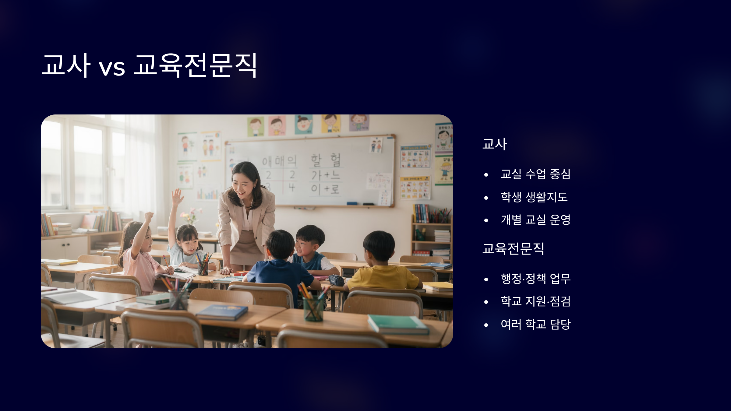 교육전문직은 수업을 하지 않고 행정과 정책 업무를 담당하게 됩니다.