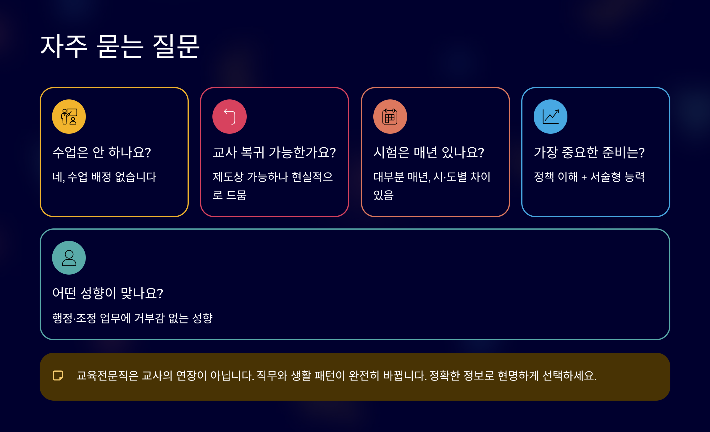 시험 구조와 업무 성격, 연봉 체계가 교사와 상당히 다르기 때문입니다.