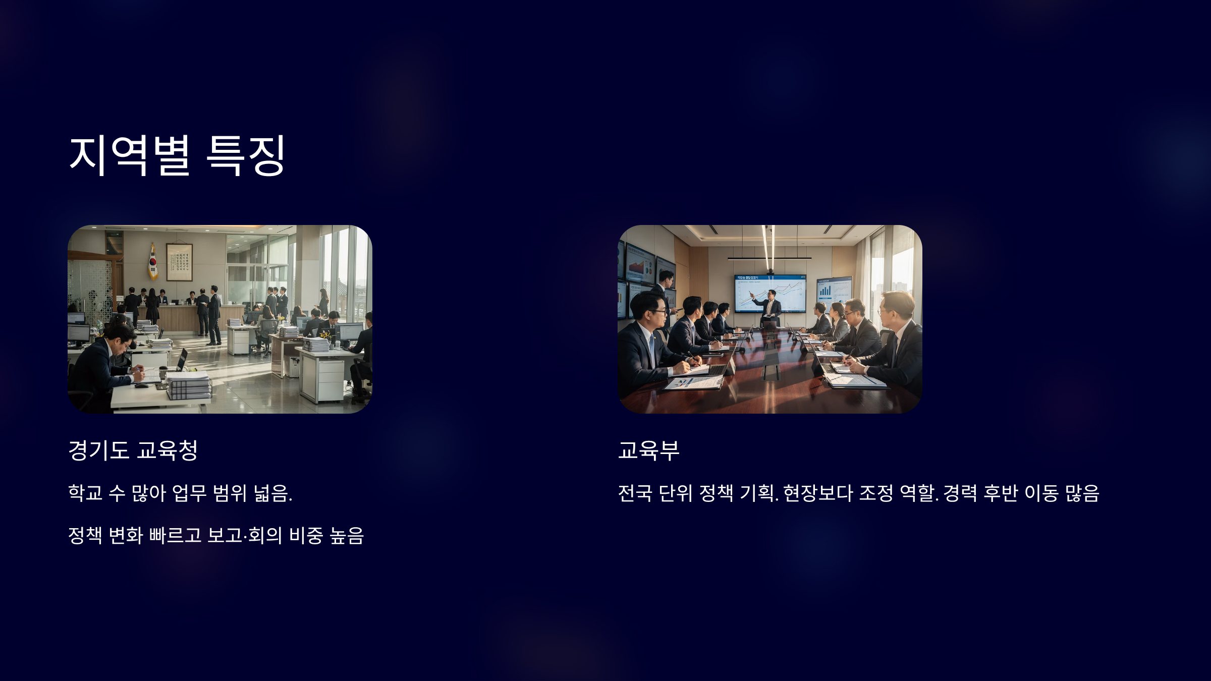 교육부 교육전문직은 전국 단위 정책을 다룹니다. 현장 지원보다 기획과 조정 역할이 큽니다.