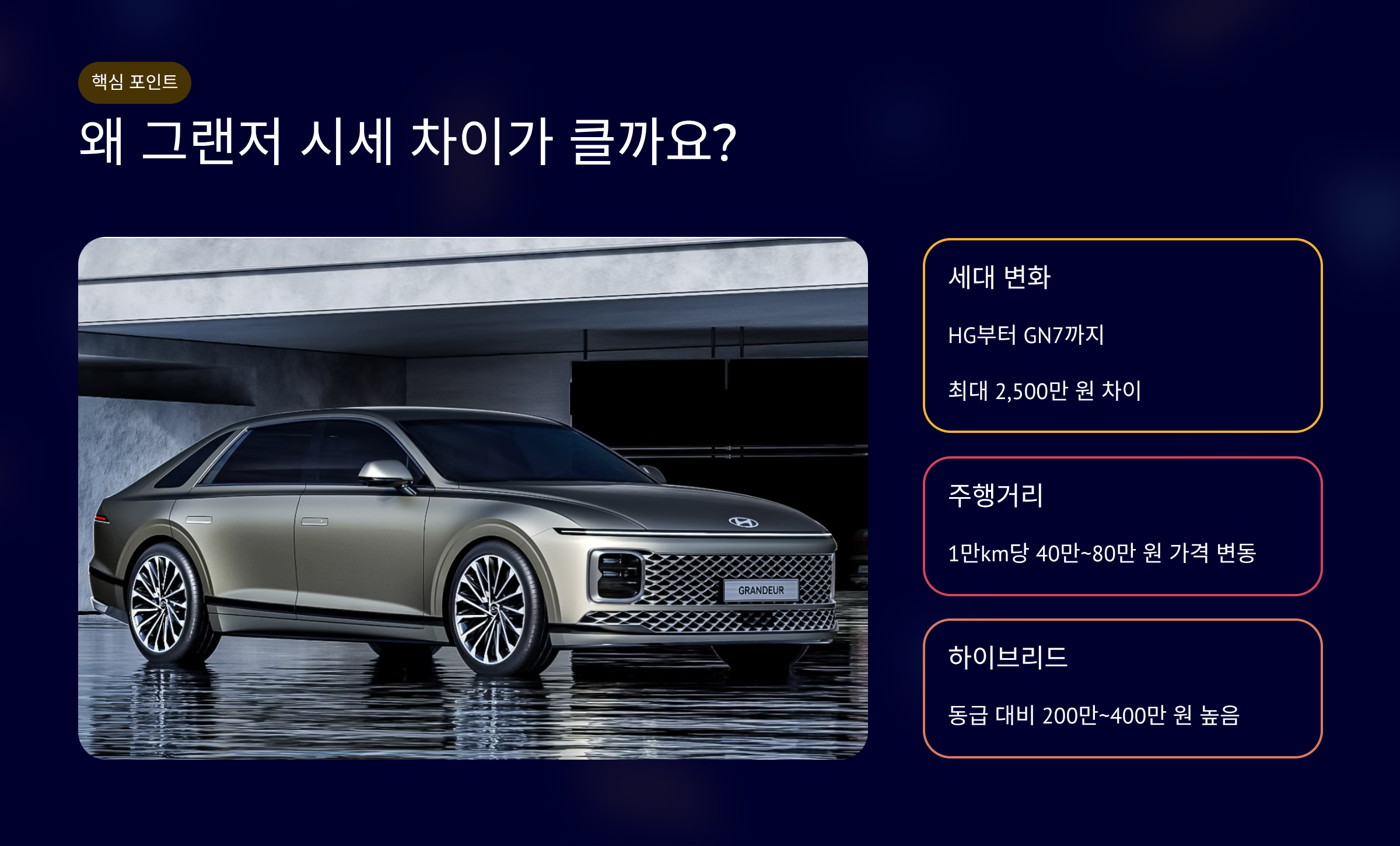 그랜저는 HG(2011~2016), IG(2017~2022), GN7(2023~) 세대로 나뉩니다.