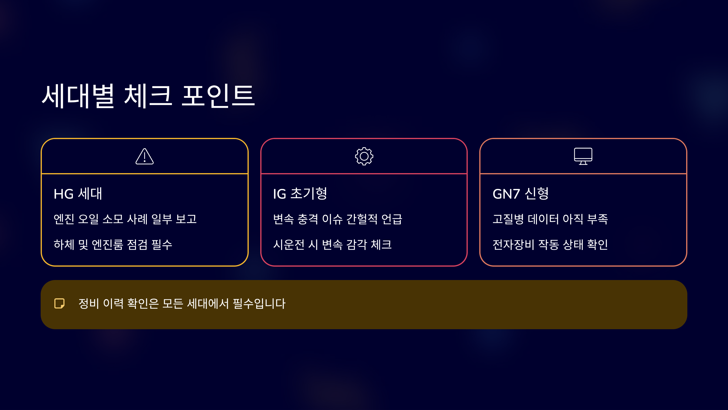 GN7은 아직 고질병 데이터가 많지 않습니다만 전자장비 점검은 필요합니다.