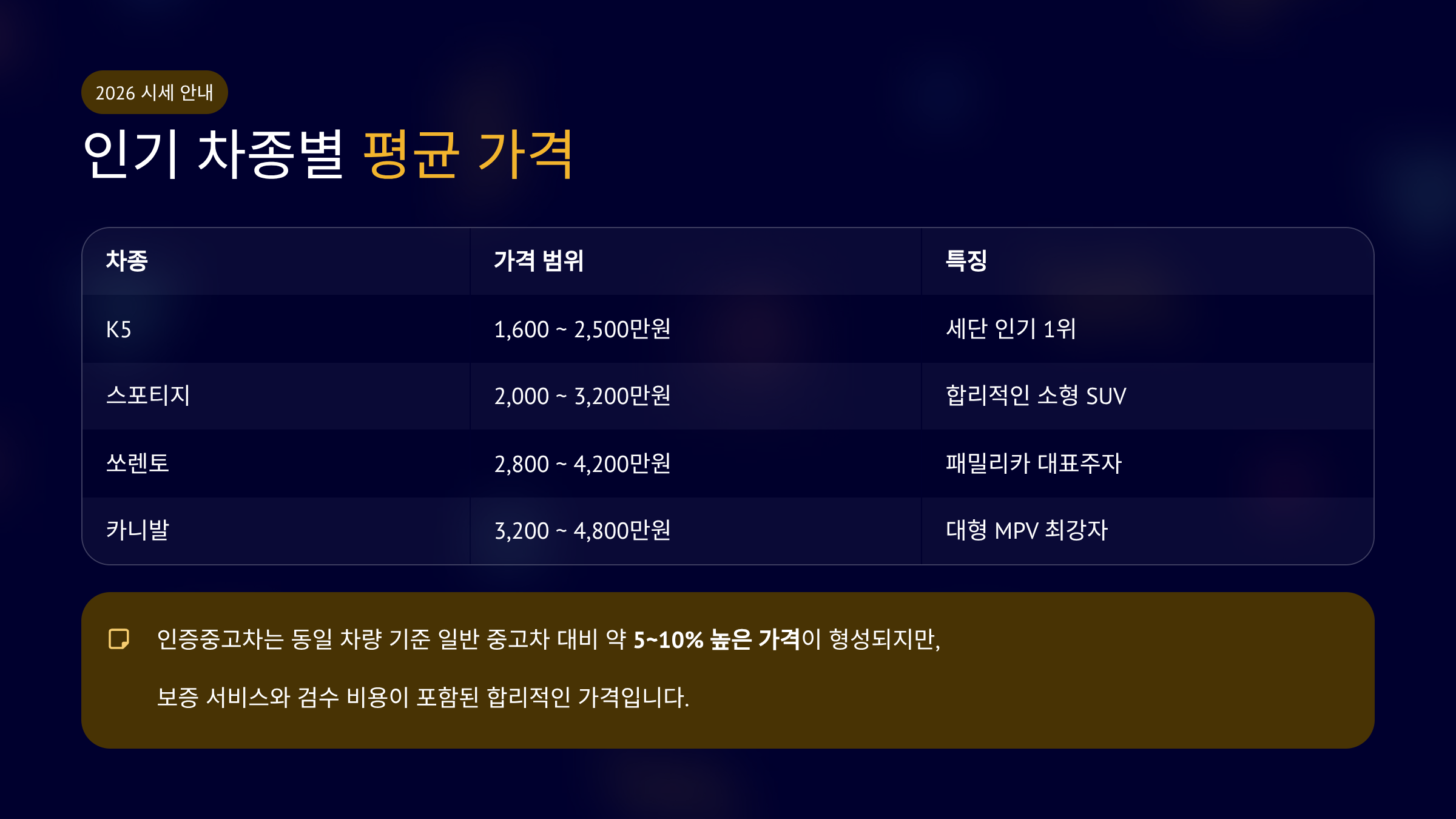 대표 인기 차종 평균 시세는 다음과 같습니다.