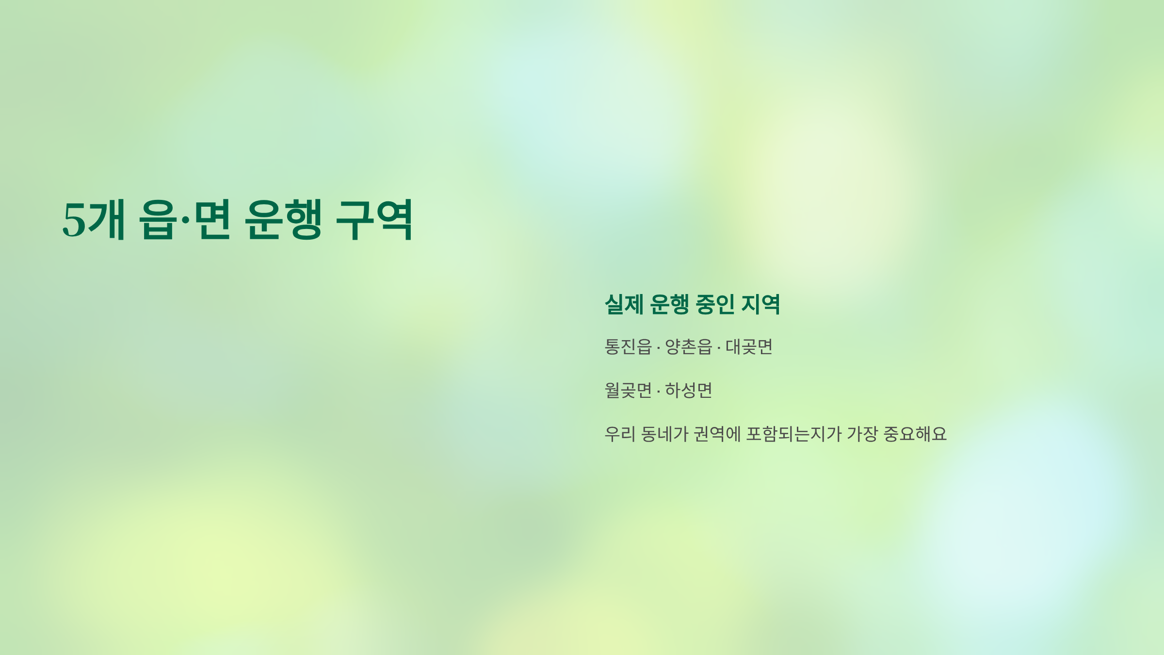 하지만 통진읍, 양촌읍, 대곶면, 월곶면, 하성면처럼 대중교통이 불편했던 지역에서는 분명 실질적인 대안이 될 수 있어요.