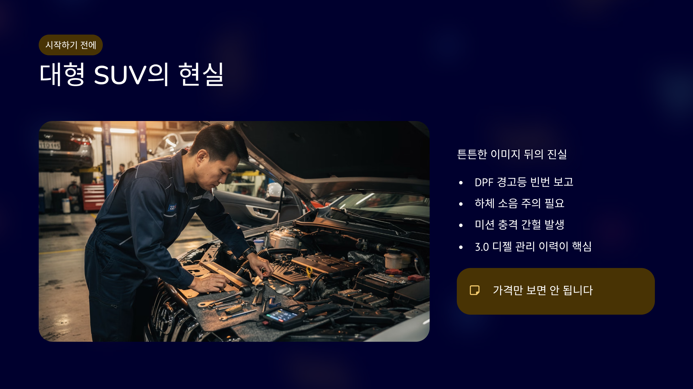 대형 SUV는 튼튼하다는 이미지가 강합니다. 하지만 모하비도 예외는 아니었죠. DPF 경고등, 하체 소음, 간헐적 미션 충격 이야기가 중고 시장에서 자주 언급됩니다. 그래서 가격만 보고 접근하면 낭패를 볼 수 있습니다. 특히 3.0 디젤 특성상 관리 이력에 따라 상태 차이가 큽니다. 2026년 현재 실거래 기준으로 연식·연비·가격을 정확히 짚어보겠습니다. 고질병과 실제 오너 후기도 함께 보셔야 합니다.