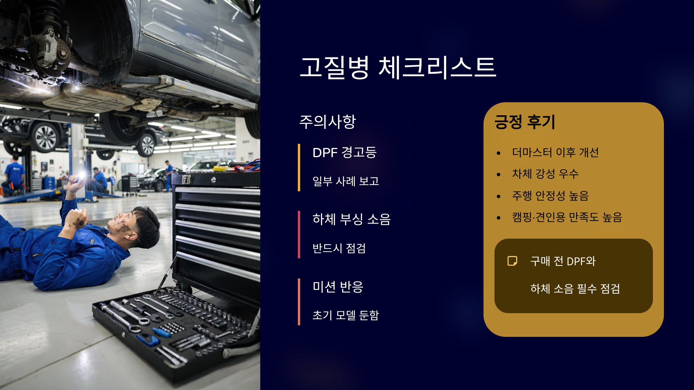 DPF 경고등 사례가 일부 있습니다. 하체 부싱 소음 보고도 존재합니다. 초기 모델에서 미션 반응이 둔하다는 평가도 있었죠. 더마스터 이후 개선됐다는 후기가 많습니다. 차체 강성과 주행 안정성은 높은 점수를 받습니다. 캠핑·견인용 만족도는 상당히 높아요. 구매 전 DPF 상태와 하체 소음은 꼭 점검하세요.