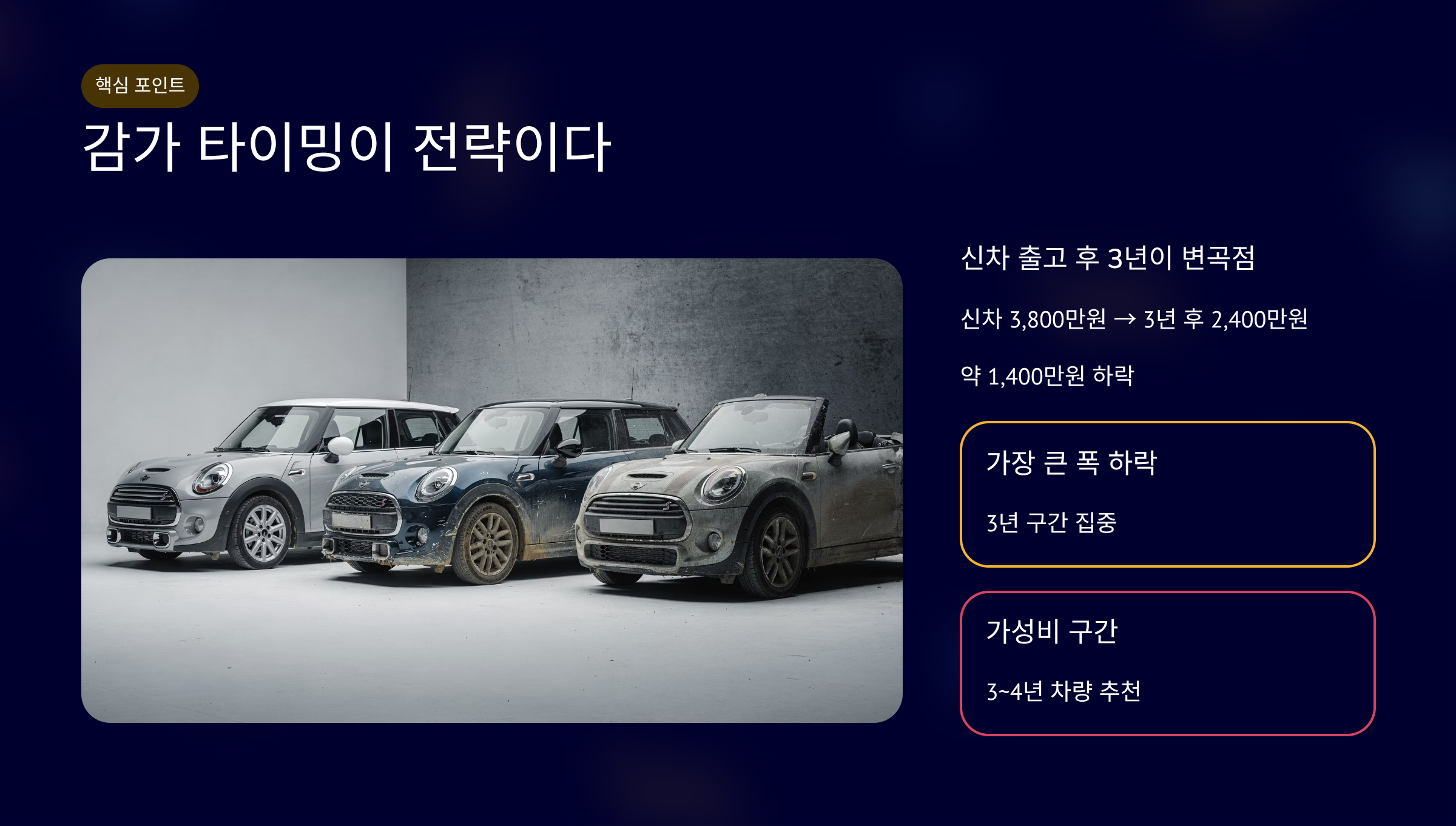 그래서 3~4년 된 차량이 가성비 구간이라 평가받습니다.
