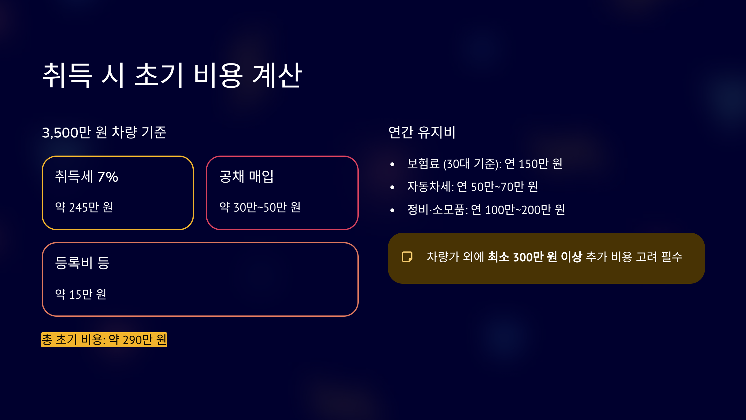3,500만 원 차량 기준 계산합니다. 취득세 7% 적용 시 약 245만 원입니다. 공채 매입은 약 30만~50만 원입니다. 등록비 포함 약 290만 원 예상됩니다. 보험료는 30대 기준 연 150만 원 수준입니다. 차량가 외 초기 비용 300만 원 이상 고려해야 합니다. 실구매 후기에서는 유지비 부담을 고려해야 한다고 합니다. 예산 계획 시 세금과 보험을 함께 계산해야 합니다.