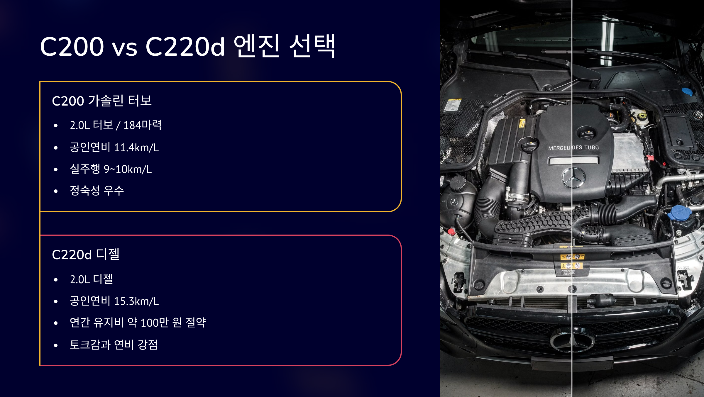 C200은 2.0 가솔린 터보입니다. 최고출력 184마력입니다. 공인연비는 11.4km/L입니다. 실주행은 9~10km/L 수준입니다. C220d는 2.0 디젤입니다. 공인연비는 15.3km/L입니다. 연 2만km 기준 유지비 차이는 약 100만 원입니다. 후기에서는 정숙성은 가솔린이 낫다고 합니다. 연비는 디젤이 확실히 유리합니다.