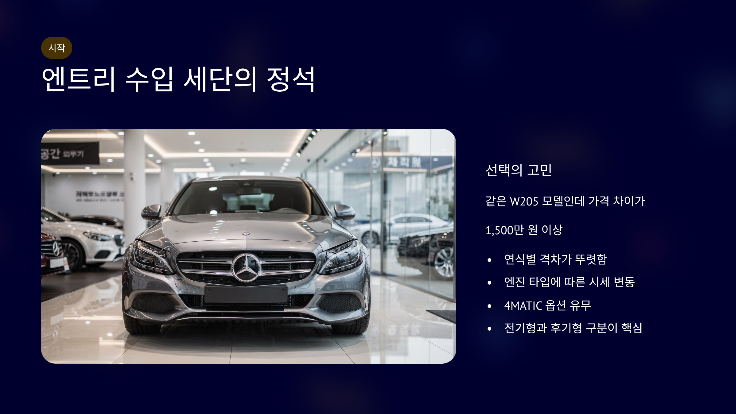 W205 전기형 감가율은 약 55% 수준입니다. 후기형은 3년 기준 약 30%입니다. 2020년 C200 평균 3,200만 원입니다. 2021년 C220d 평균 3,600만 원입니다. 4MATIC은 150만~250만 원 높습니다. 후기형은 MBUX 적용으로 가격 방어가 강합니다. 딜러 현장에서는 화이트·블랙 색상 거래가 빠릅니다. 옵션 구성에 따라 시세 차이가 큽니다.