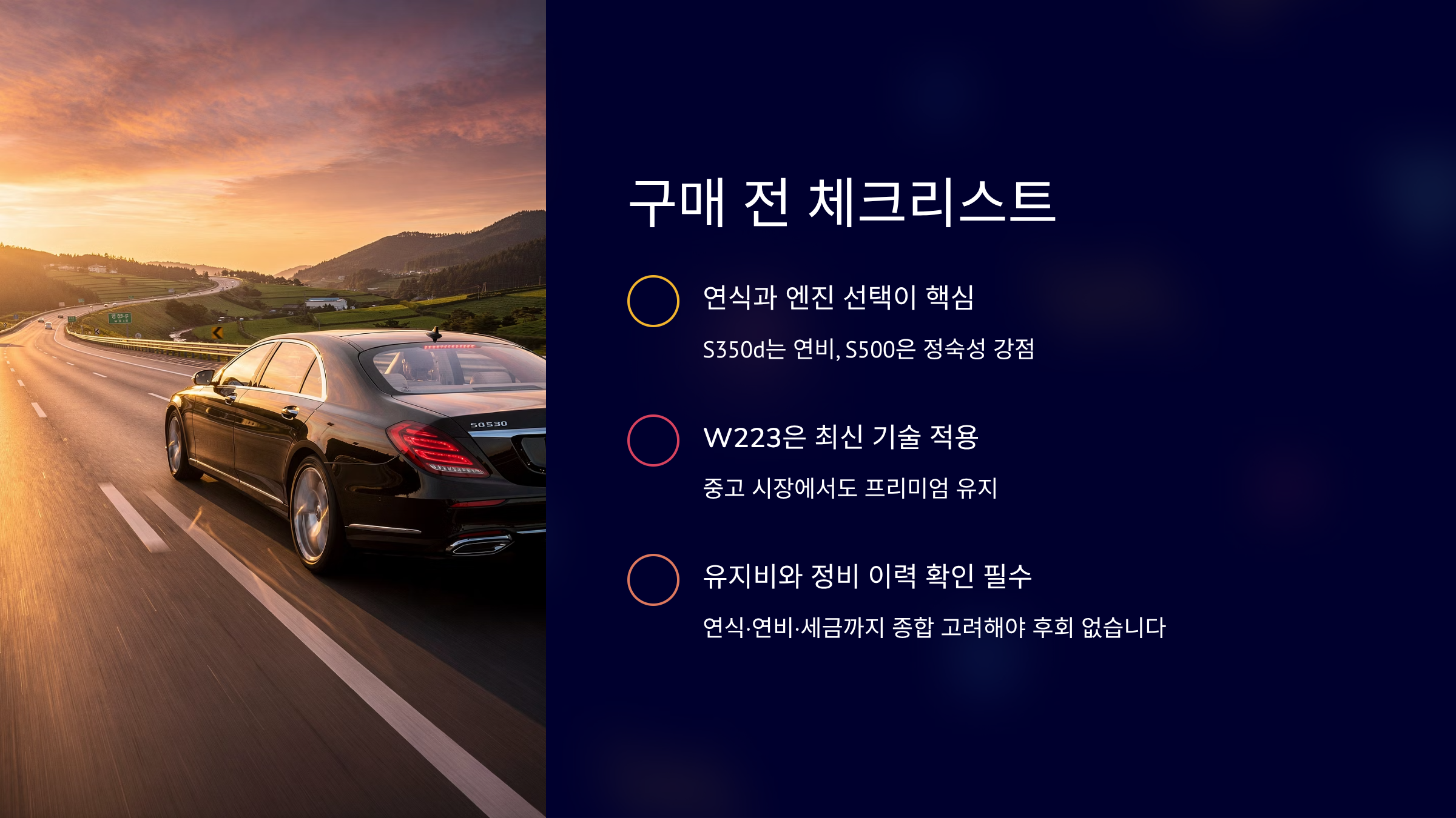 벤츠 s클래스 중고차 시세는 연식과 엔진 선택이 핵심입니다. S350d는 연비가 강점입니다. S500은 정숙성과 출력이 좋습니다. W223은 최신 기술이 적용됩니다. 구매 전 유지비와 정비 이력을 반드시 확인하시기 바랍니다. 연식·연비·세금까지 고려해야 후회가 적습니다.