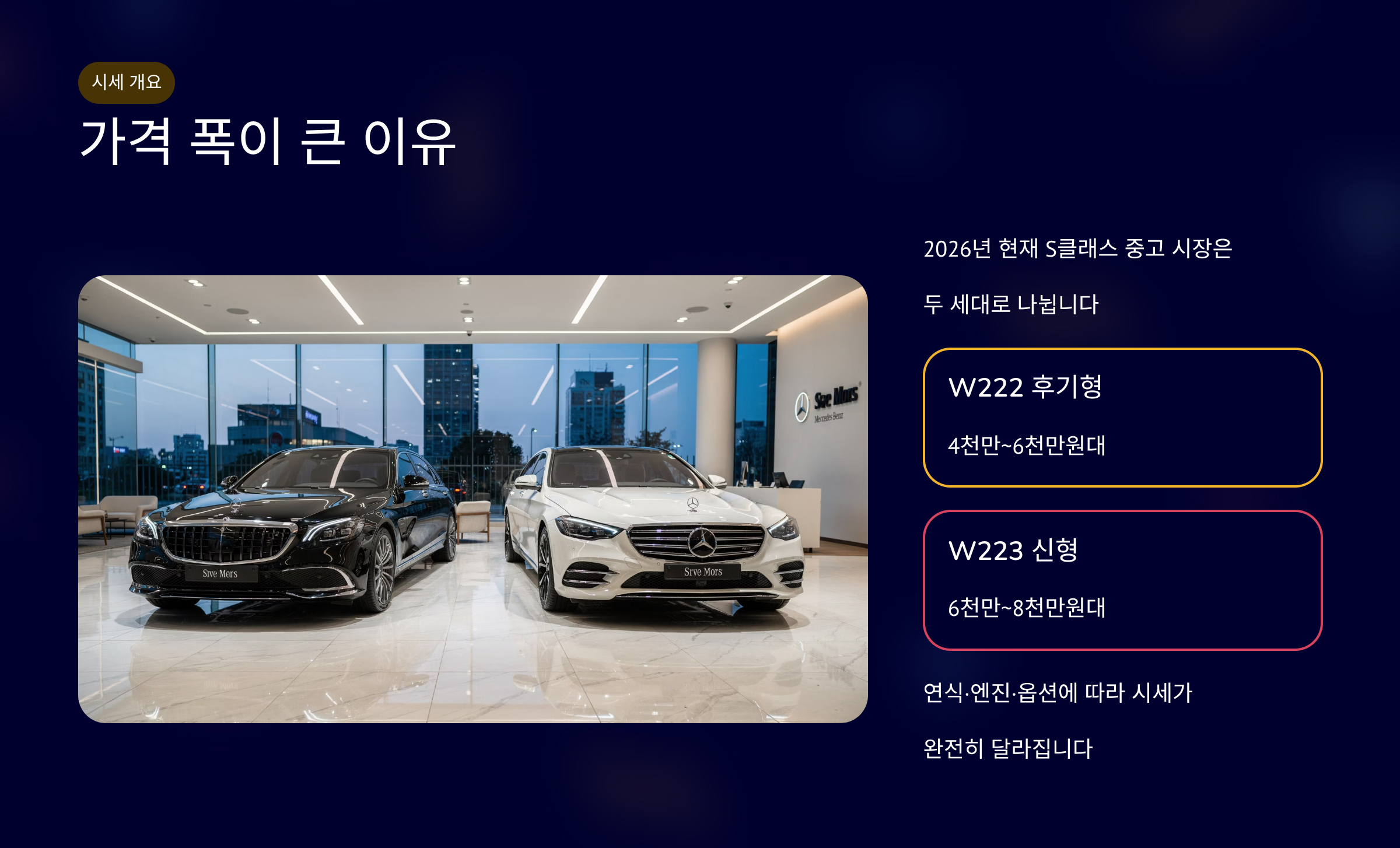 플래그십 세단을 고민하면 결국 S클래스를 보게 됩니다. 그런데 중고 시세를 보면 4천만원대부터 8천만원대까지 폭이 큽니다. 같은 S클래스인데 왜 이렇게 차이가 날까요. 2026년 현재는 W222 후기형과 W223 신형의 격차가 분명합니다. 벤츠 s클래스 중고차 시세는 연식과 엔진에 따라 완전히 달라집니다. 지금부터 종류별 연식, 연비, 가격을 구체적으로 정리해 드리겠습니다.