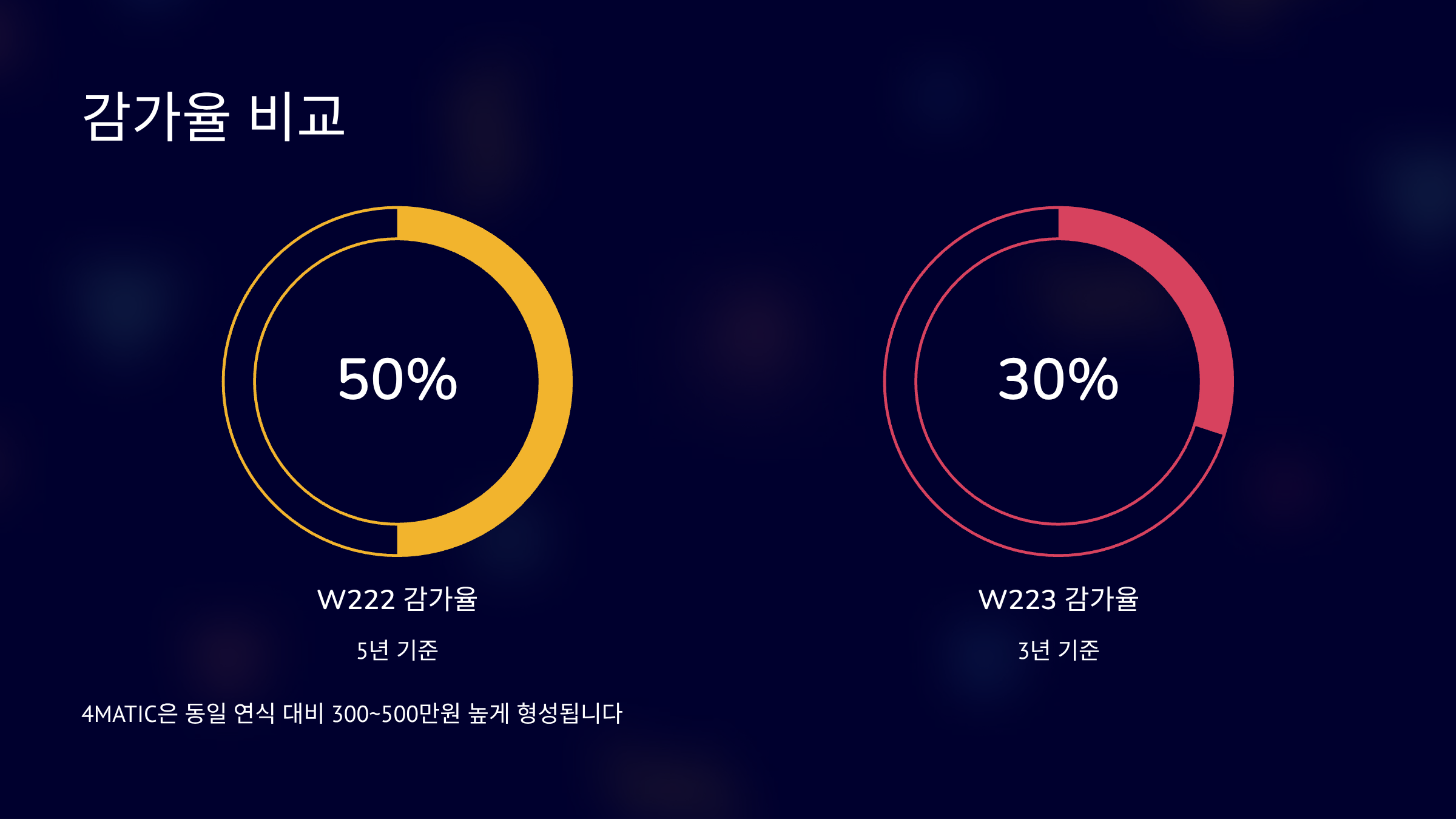 W222 감가율은 5년 기준 약 50% 수준입니다. W223은 3년 기준 약 30% 감가입니다. 2020년 S350d 평균 5,500만 원입니다. 2021년 S500 평균 7,200만 원입니다. 4MATIC은 동일 연식 대비 300만~500만 원 높습니다. 후기형은 디지털 실내 개선으로 가격 방어가 강합니다. 딜러 현장에서는 블랙 색상이 가장 빠르게 거래됩니다. 옵션과 정비 이력이 시세에 큰 영향을 줍니다.