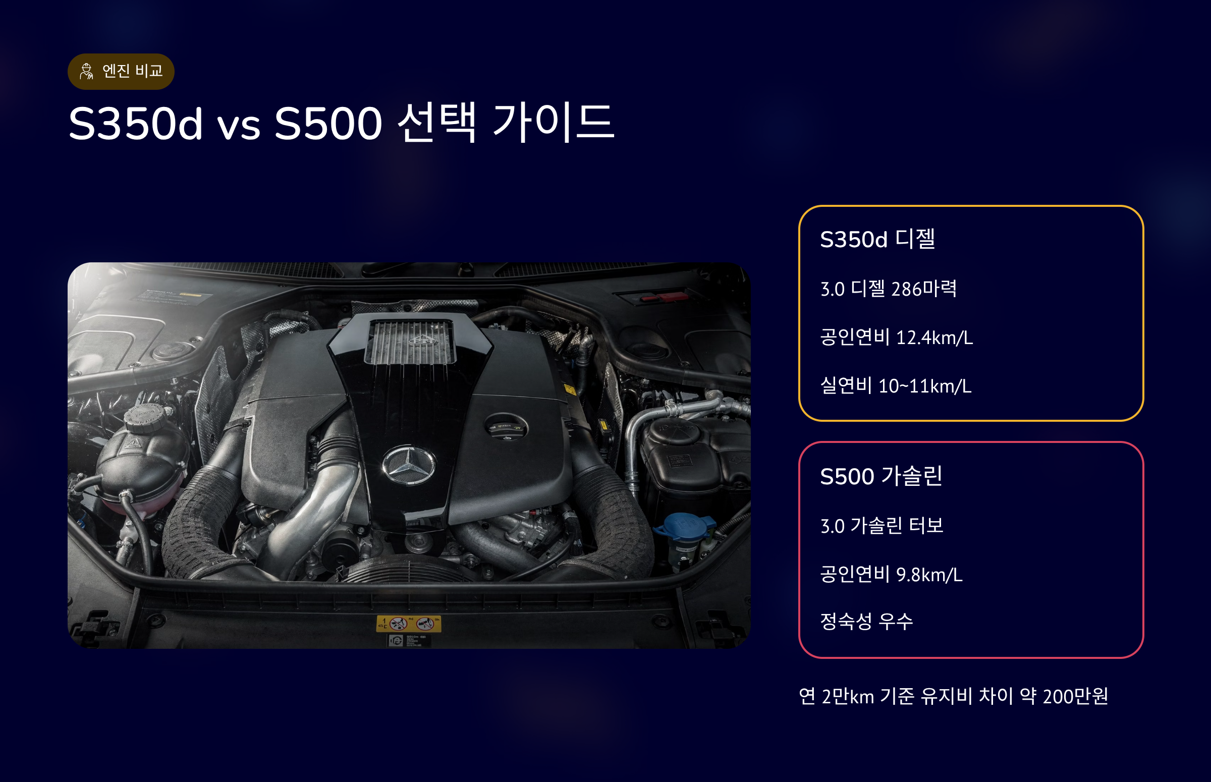S350d는 3.0 디젤 엔진입니다. 최고출력 286마력입니다. 공인연비는 12.4km/L입니다. 실주행은 10~11km/L 수준입니다. S500은 3.0 가솔린 터보입니다. 공인연비는 9.8km/L입니다. 연 2만km 기준 유지비 차이는 약 200만 원입니다. 후기에서는 정숙성은 가솔린이, 연비는 디젤이 유리하다고 합니다.