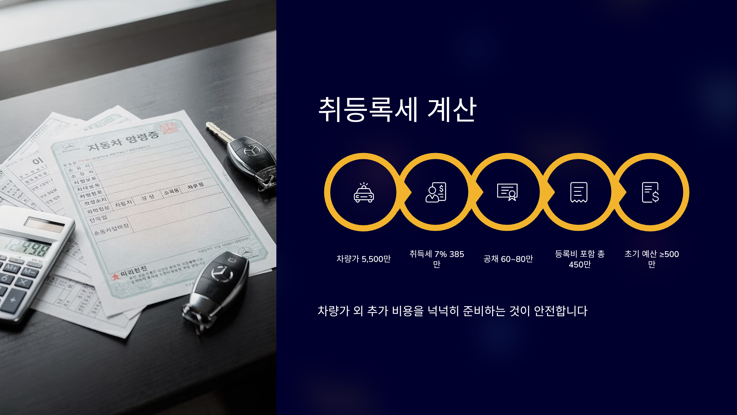 5,500만 원 차량 기준 계산합니다. 취득세 7% 적용 시 약 385만 원입니다. 공채 매입은 약 60만~80만 원입니다. 등록비 포함 약 450만 원 예상됩니다. 보험료와 세금까지 합하면 초기 비용이 큽니다. 차량가 외 500만 원 이상 준비하는 것이 안전합니다. 실구매 후기에서는 초기 비용이 생각보다 높다고 합니다. 총예산을 넉넉히 계획하는 것이 좋습니다.