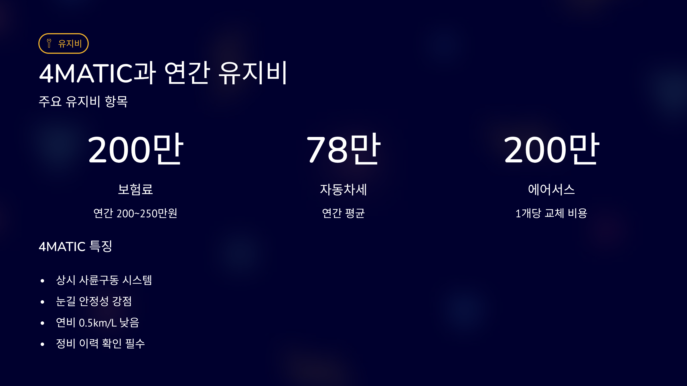 4MATIC은 상시 사륜구동 시스템입니다. 눈길 안정성이 강점입니다. 연비는 일반 모델보다 약 0.5km/L 낮습니다. 보험료는 연 200만~250만 원입니다. 자동차세는 연 78만 원 수준입니다. 에어서스펜션 교체 비용은 1개당 200만 원 내외입니다. 후기에서는 유지비 부담을 가장 크게 느낀다고 합니다. 정비 이력 확인이 매우 중요합니다.