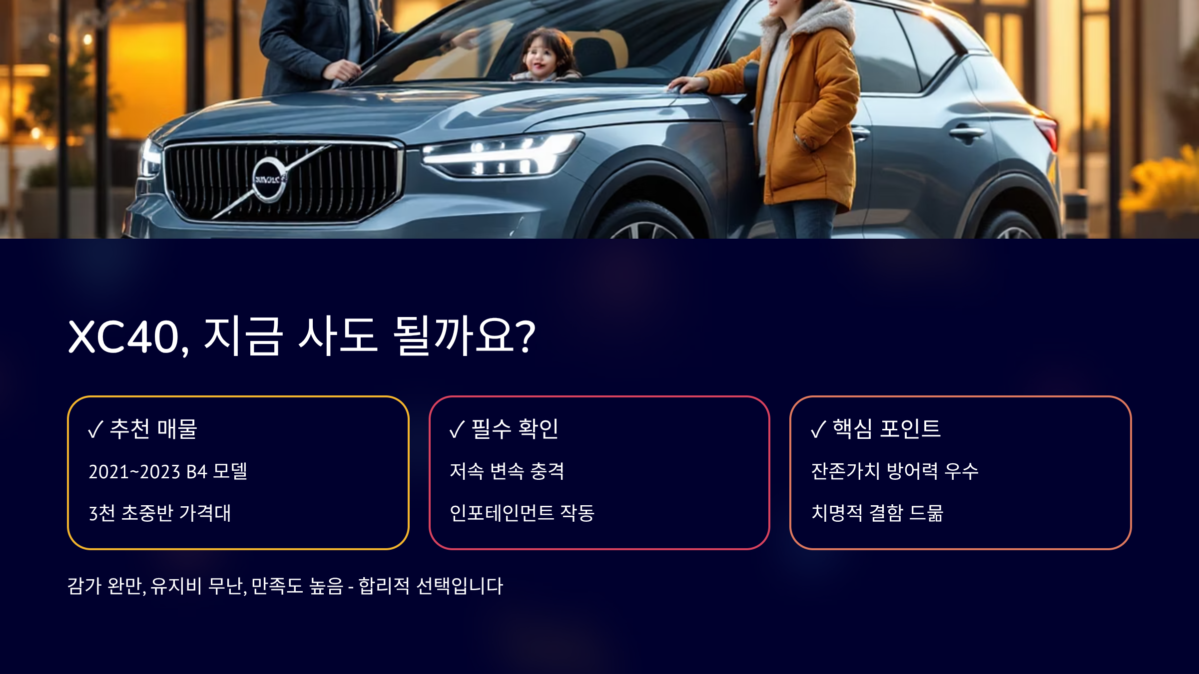 수입 SUV는 감가가 빠르다지만, 예외도 있습니다. 볼보 XC40은 생각보다 단단하게 버티는 차종이죠. 하지만 중고 시장에서는 다른 이야기가 나옵니다. 인포테인먼트 오류, 간헐적 변속 충격 같은 고질병 이야기가 돌기 때문입니다. 그래서 2026년 지금, 실제 시세와 고질병을 함께 봐야 합니다. 가격만 보고 들어갔다가 유지비에서 놀라면 곤란하니까요. 오늘은 연식·연비·실거래가를 숫자로 정리해드립니다.