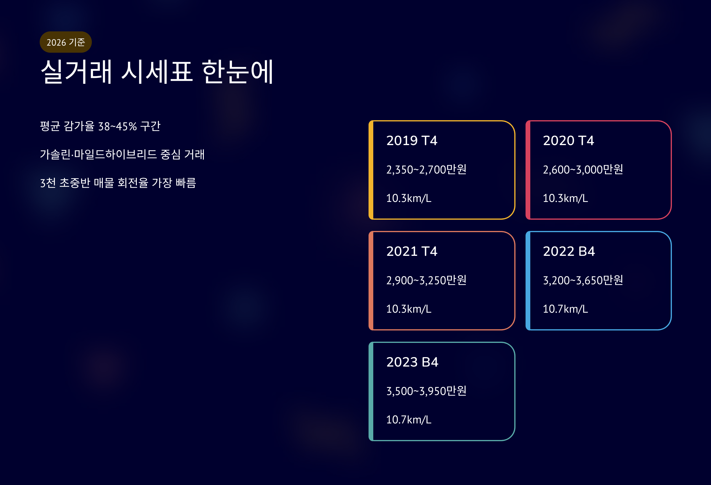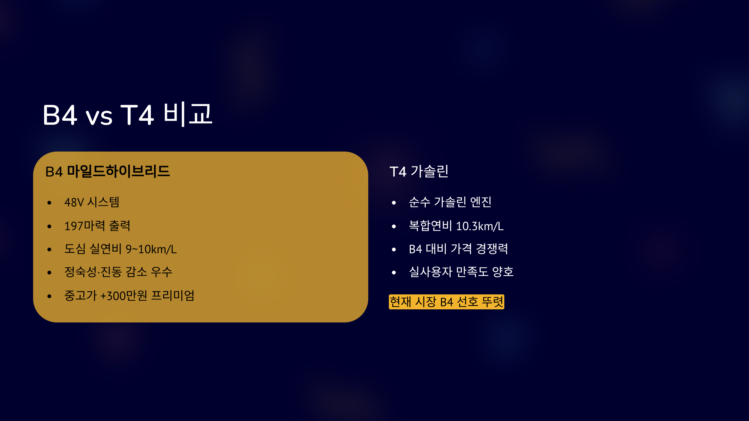 B4는 48V 마일드하이브리드입니다. 출력 197마력 수준입니다. 실연비는 도심 9~10km/L 정도 나온다. 가솔린 T4 대비 정숙성이 낫다는 평가가 많아요. 중고가도 T4보다 약 300만원 높습니다. 실사용자는 진동 감소에 만족한다 합니다. 현재 시장에서는 B4 선호가 뚜렷합니다.