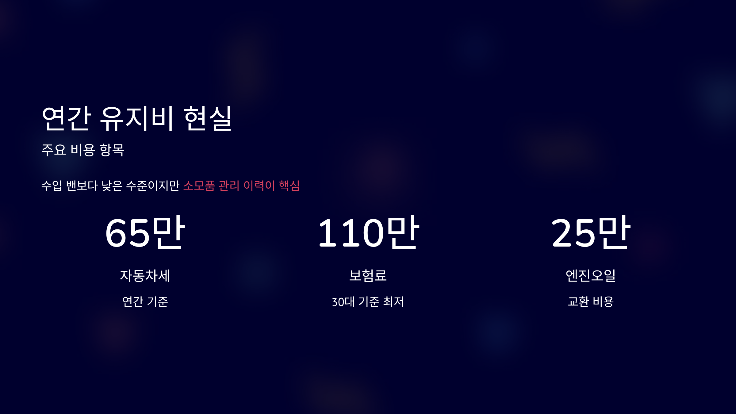 자동차세 연 65만원 수준입니다. 보험료는 30대 기준 110만~150만원입니다. 엔진오일 교환 25만~35만원입니다. DPF 교체 비용은 200만원 전후입니다.