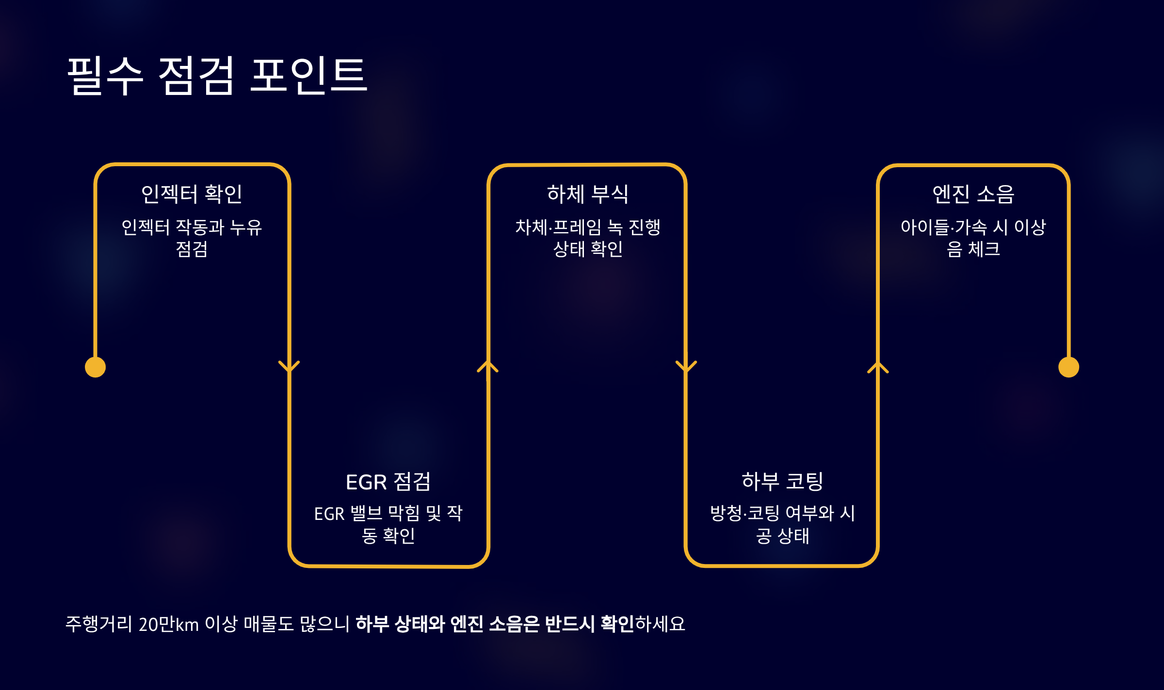인젝터 고장 사례가 있습니다. EGR 밸브 막힘 보고도 존재합니다. 하체 부식은 연식에 따라 심화됩니다. 하부 코팅 여부 확인해야 합니다.