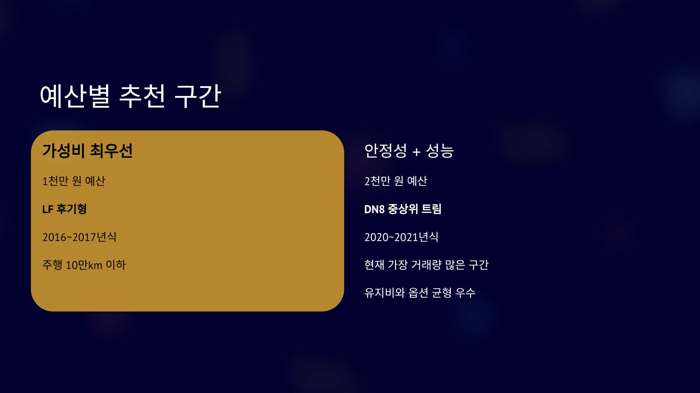 1천만 원 예산이라면 LF 후기형이 적합합니다.