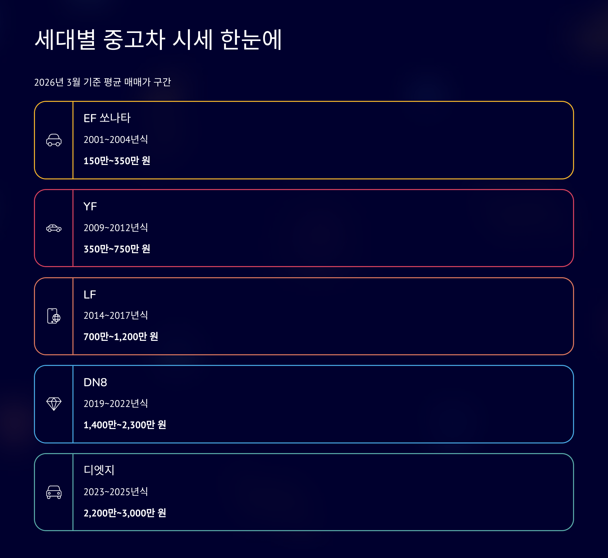 - EF 쏘나타 (2001~2004) 150만~350만 원