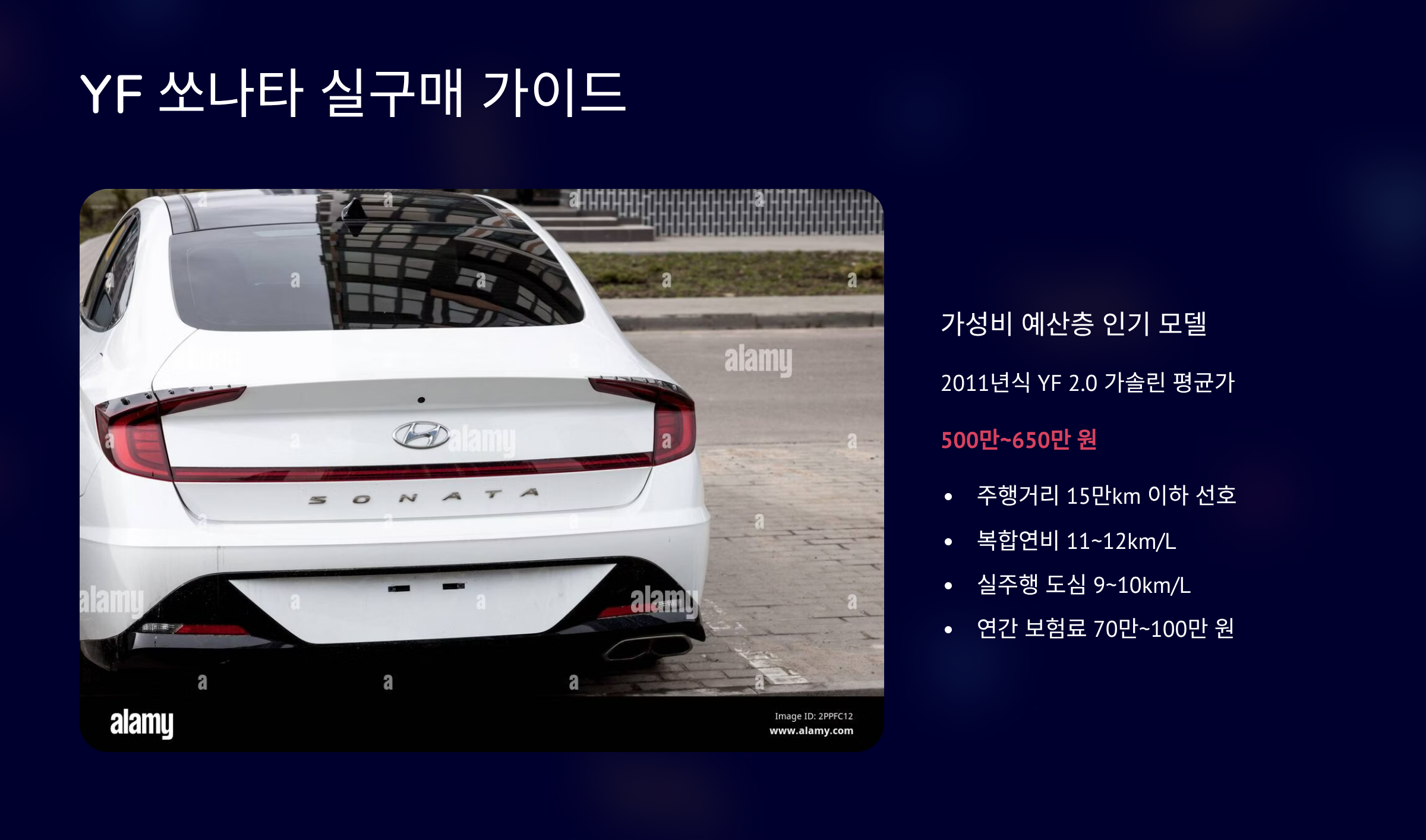 2011년식 YF 2.0 가솔린은 평균 500만~650만 원입니다.