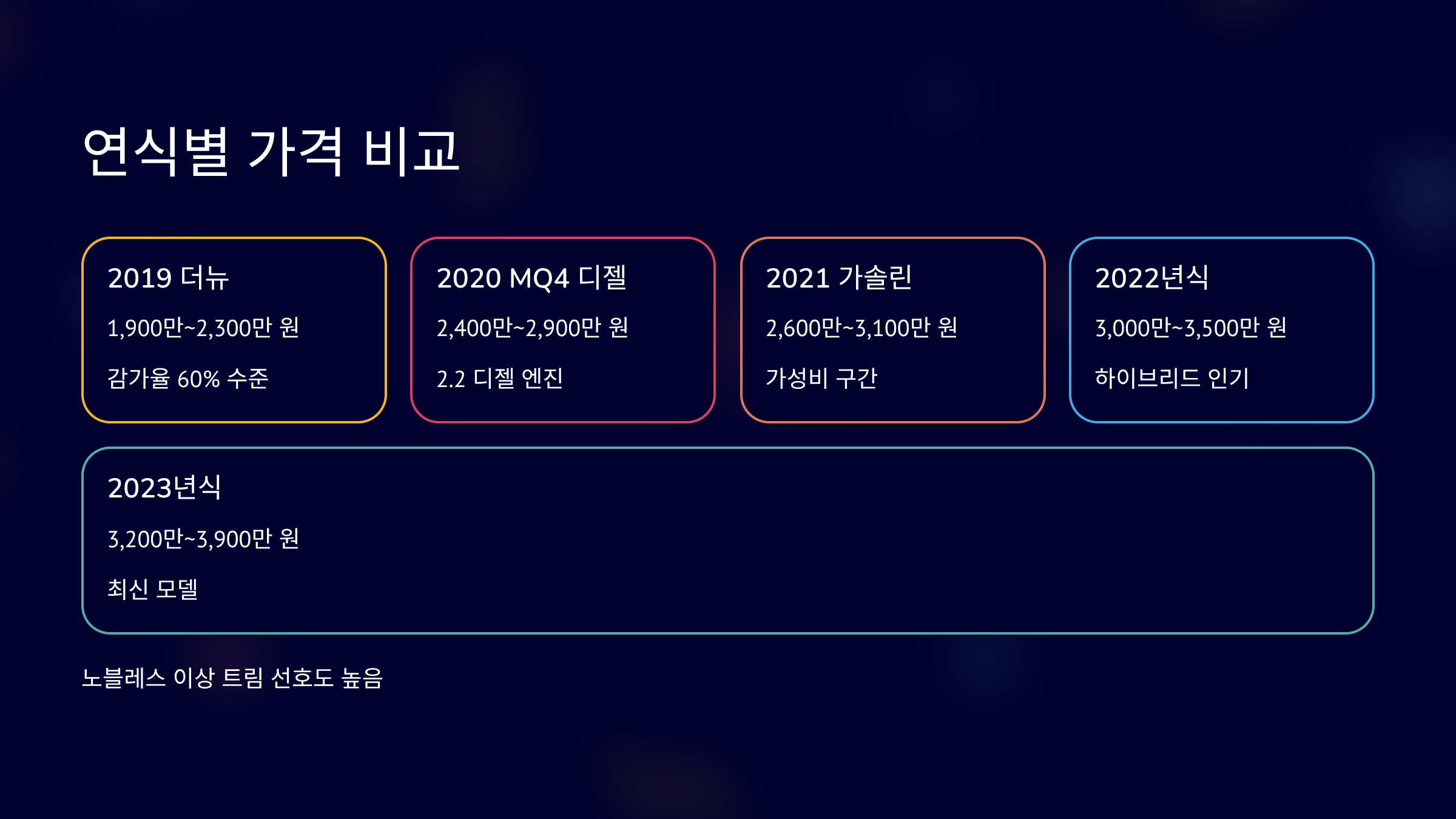2019년 더뉴 쏘렌토는 1,900만~2,300만 원입니다. 2020년 MQ4 2.2 디젤은 2,400만~2,900만 원입니다. 2021년 MQ4 가솔린은 2,600만~3,100만 원입니다. 2022년식은 3,000만~3,500만 원 구간입니다. 2023년식은 3,200만~3,900만 원입니다. 같은 연식이라도 주행거리 5만km 이하 차량은 200만 원 이상 차이 납니다. 실구매 후기에서는 노블레스 이상 트림 선호가 높다고 합니다. 부분변경 전·후 구분이 시세 차이를 만듭니다.