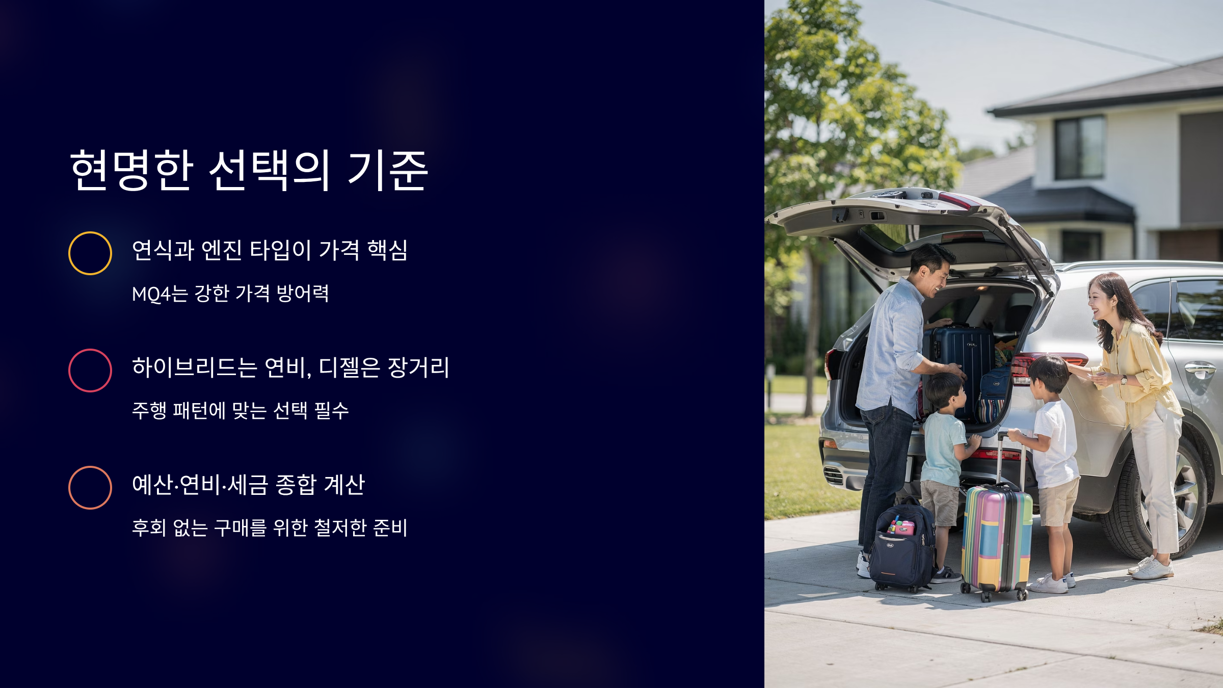 Q. 3천만원대로 구매 가능합니까? A. 2021년식은 가능합니다. Q. 취등록세는 얼마인가요? A. 3천만원 기준 약 210만 원입니다. Q. 하이브리드 배터리 보증은요? A. 10년·20만km 적용됩니다. Q. 추천 연식은 언제인가요? A. 2021~2022년 MQ4가 가성비 좋습니다. Q. 디젤 고질병 있나요? A. DPF 관리가 중요합니다. Q. 보험료는 어느 정도입니까? A. 40대 기준 연 110만~150만 원입니다. Q. 첫 패밀리카로 괜찮습니까? A. 공간과 안전성 면에서 충분합니다.