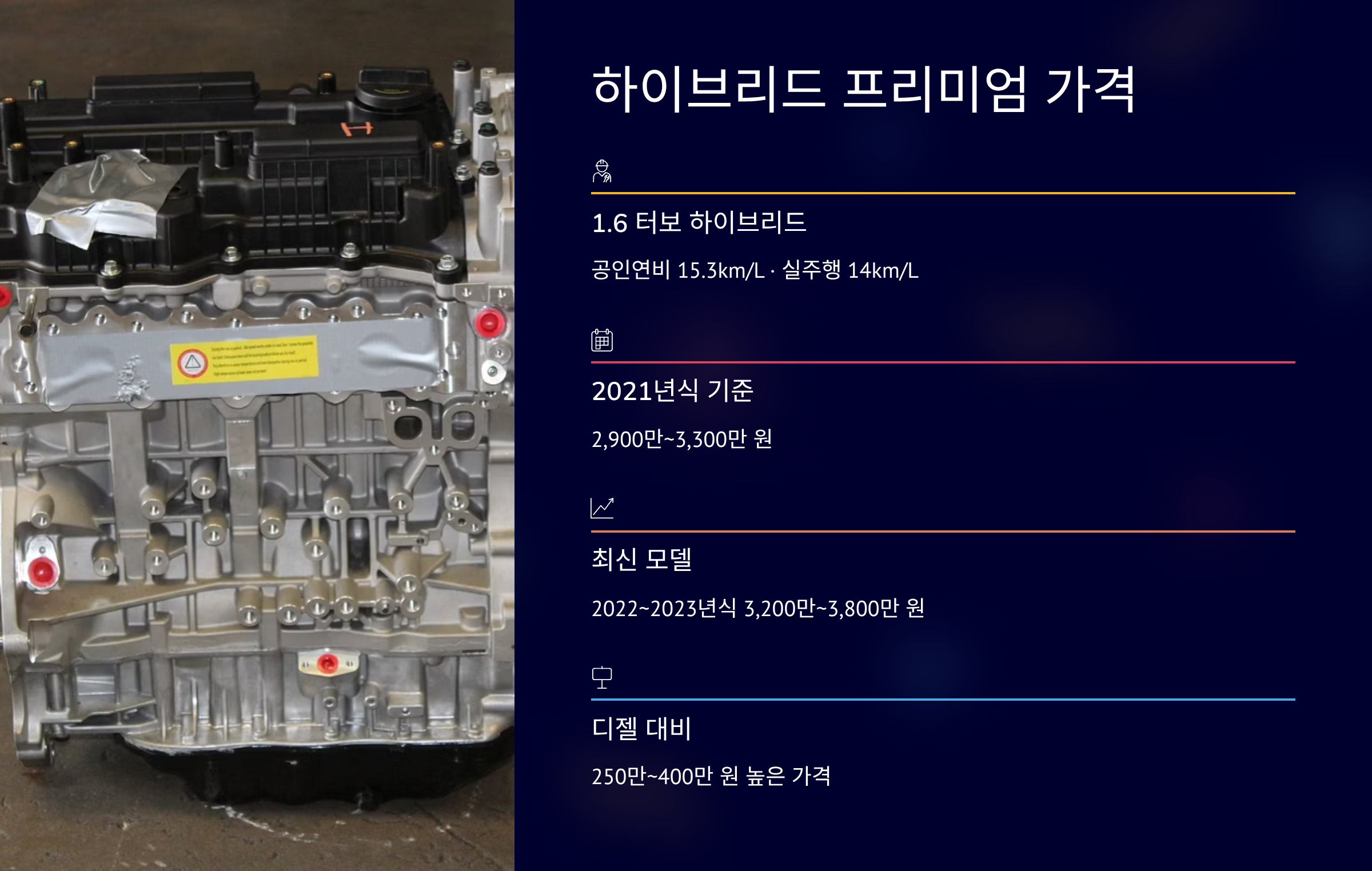 하이브리드는 1.6 터보 기반입니다. 공인연비는 15.3km/L입니다. 실주행은 14km/L 전후입니다. 2021년식은 2,900만~3,300만 원입니다. 2022~2023년식은 3,200만~3,800만 원입니다. 동일 연식 디젤 대비 250만~400만 원 높게 형성됩니다. 실사용 후기에서는 도심 연비 만족도가 높다고 합니다. 유지비 절감 목적 수요가 꾸준합니다.