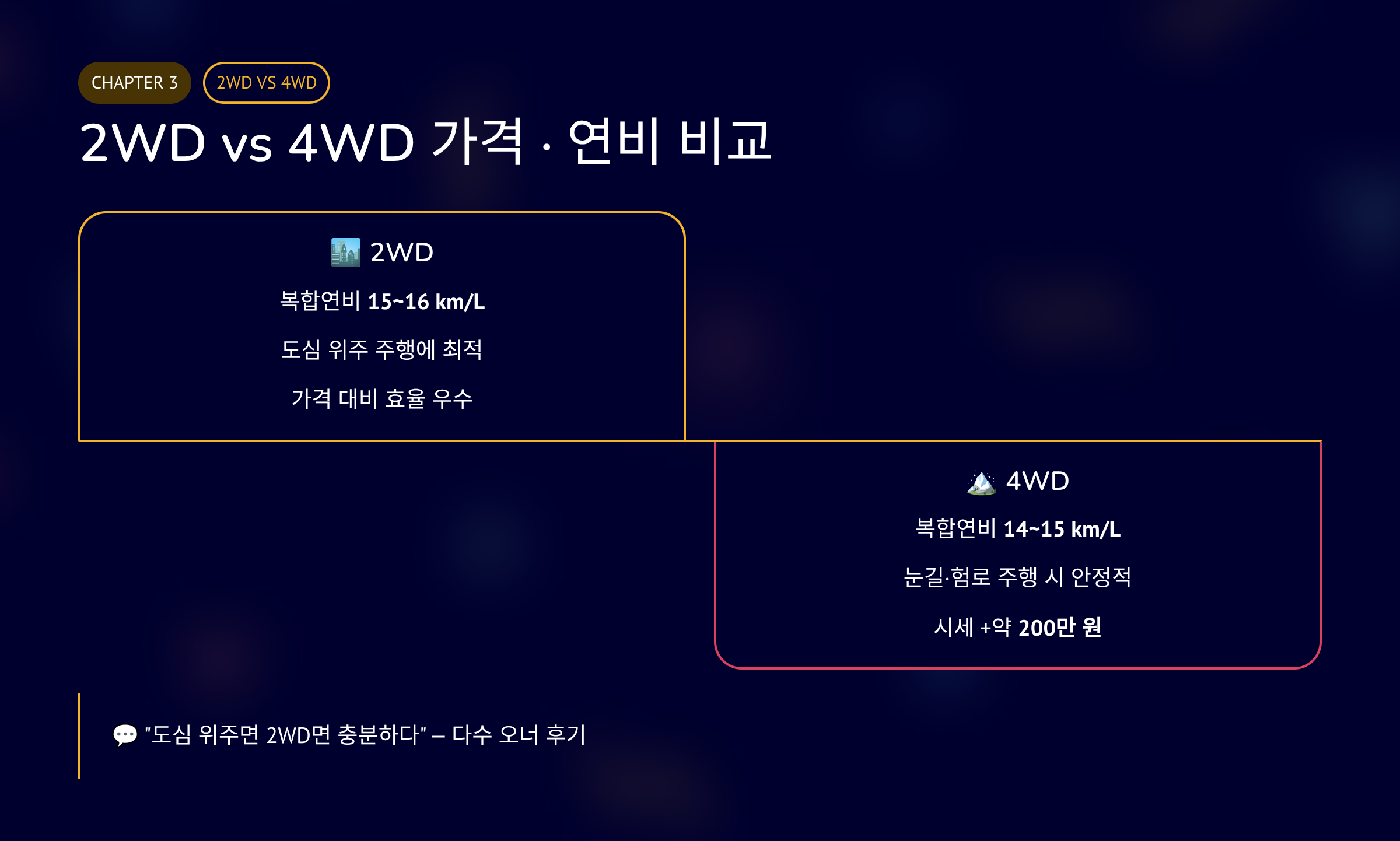 후기에서는 “도심 위주면 2WD면 충분하다”는 평가가 많습니다. 중고 시세 차이는 평균 200만 원 안팎입니다.