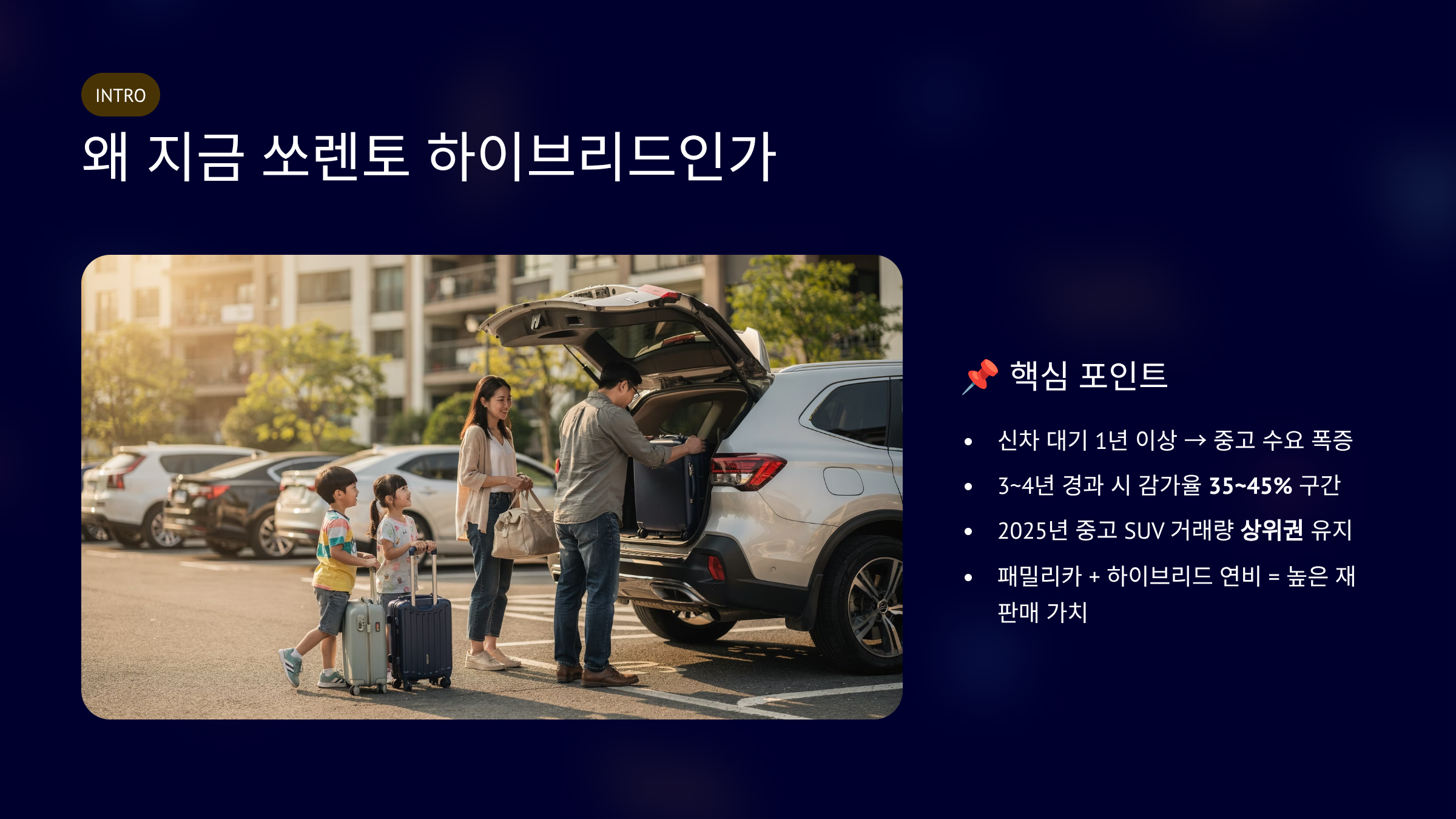 신차 대기만 1년 넘게 걸리던 SUV가 있습니다. 그런데 3~4년이 지나자 감가율이 35~45% 구간까지 내려왔습니다. 쏘렌토 하이브리드는 2025년 중고 SUV 거래 상위권을 유지하며 시장에서 존재감을 이어가고 있습니다.