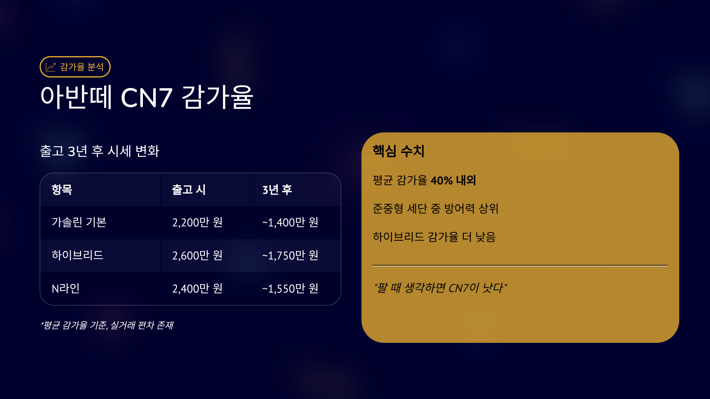 출고가 2,200만 원대 차량이 3년 후 약 1,400만 원대에 형성됩니다. 감가율은 평균 40% 내외입니다. 준중형 세단 중에서는 방어가 좋은 편입니다. 하이브리드는 감가율이 더 낮습니다. 후기에서도 “팔 때 생각하면 CN7이 낫다”는 평가가 많습니다. 시장 위치는 여전히 상위권입니다.