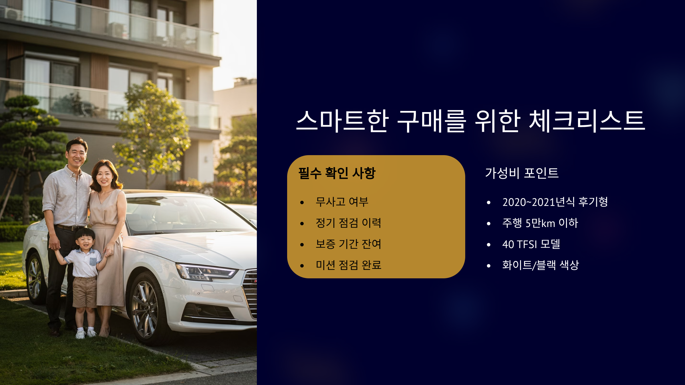 아우디 a4 중고차 가격은 연식과 옵션 선택이 핵심입니다. 40 TFSI는 균형이 좋습니다. 콰트로는 안정성이 강점입니다. 후기형은 상품성이 뛰어납니다. 고질병 점검을 반드시 진행하시기 바랍니다. 연식·연비·세금까지 계산해 선택하는 것이 중요합니다.