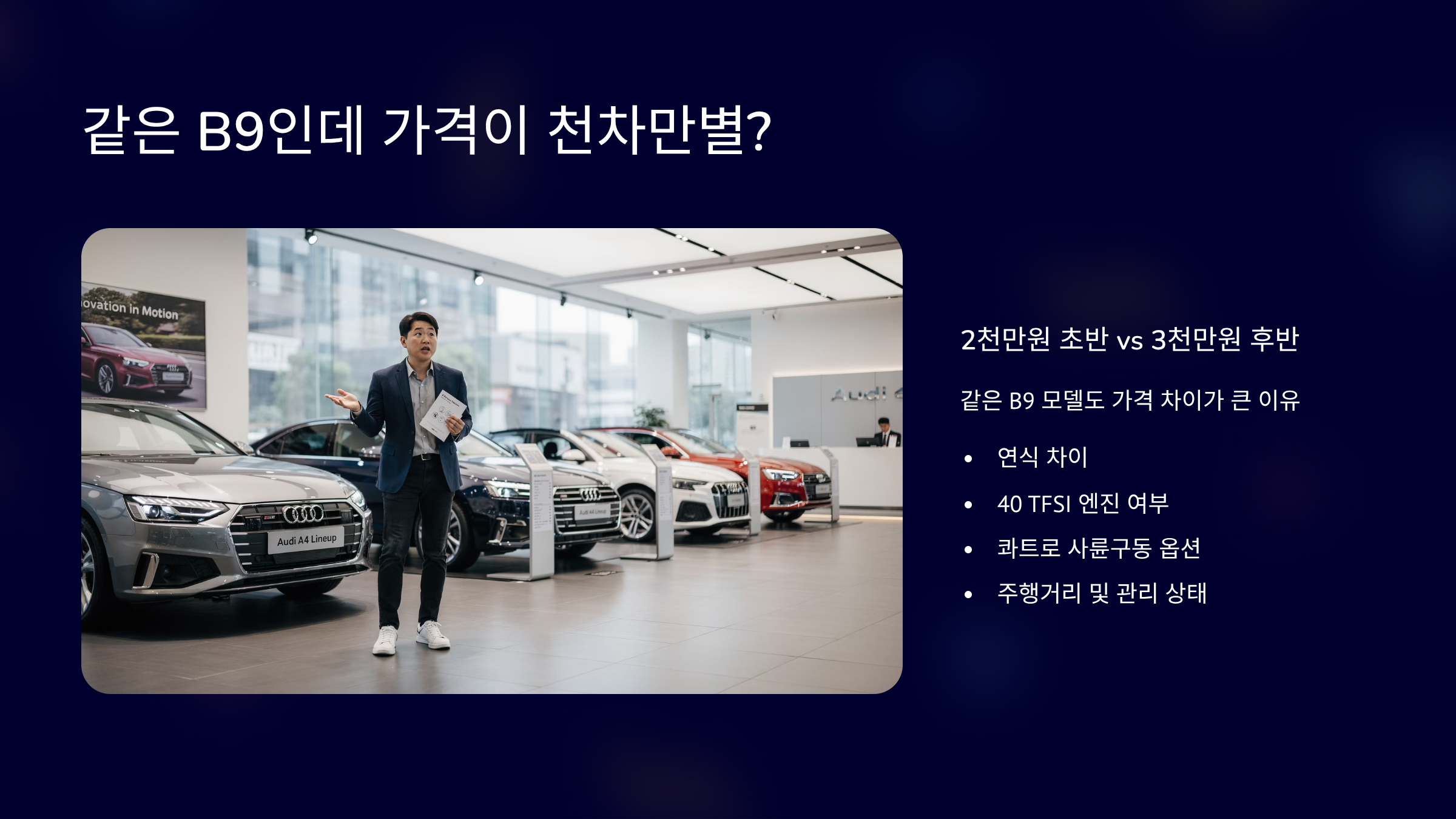 B9 감가율은 3년 기준 약 35% 수준입니다. 수입 준중형 세단 평균과 비슷합니다. 2020년 40 TFSI 평균 3,000만 원입니다. 2021년 콰트로 평균 3,500만 원입니다. 콰트로는 동일 연식 대비 150만~250만 원 높습니다. 화이트·블랙 색상이 거래가 빠릅니다. 딜러 현장에서는 무사고 차량 선호가 높습니다. 옵션 구성 차이가 시세에 영향을 줍니다.