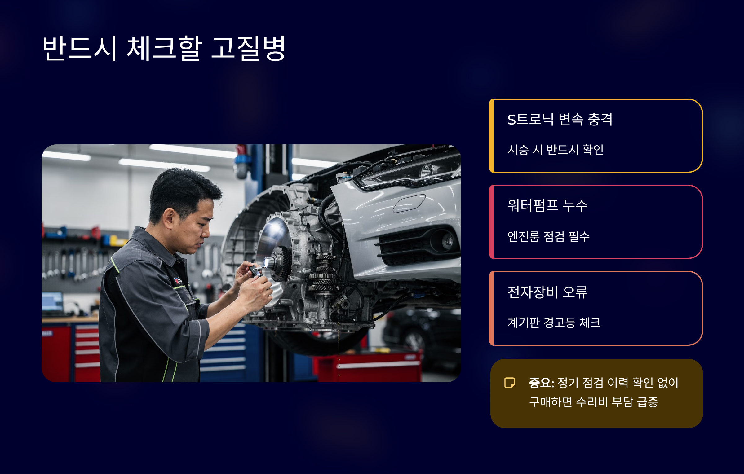 S트로닉 변속 충격 사례가 있습니다. 워터펌프 누수 이슈가 보고됩니다. 전자장비 오류 사례도 있습니다. 보증 기간 여부 확인이 중요합니다. 정기 점검 이력 확인이 필수입니다. 미션 점검 없이 구매하면 수리비 부담이 큽니다. 실구매 후기에서는 초기 점검을 권장합니다. 관리 상태가 시세보다 더 중요합니다.