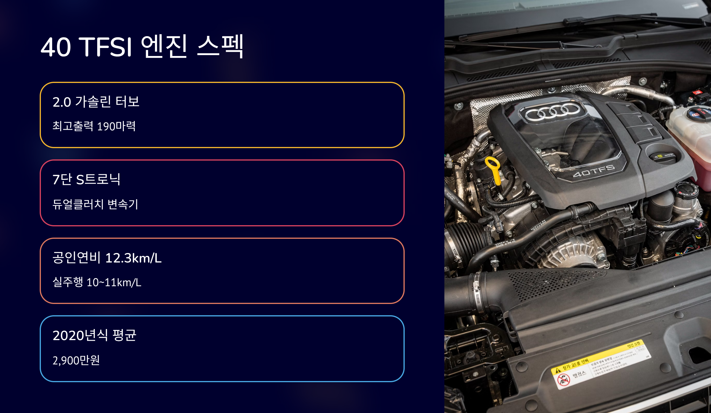 40 TFSI는 2.0 가솔린 터보입니다. 최고출력 190마력입니다. 7단 S트로닉 변속기입니다. 공인연비는 12.3km/L입니다. 실주행은 10~11km/L 수준입니다. 2020년식 평균 2,900만 원입니다. 출력과 연비 균형이 좋습니다. 후기에서는 고속 안정성이 뛰어나다는 의견이 많습니다.