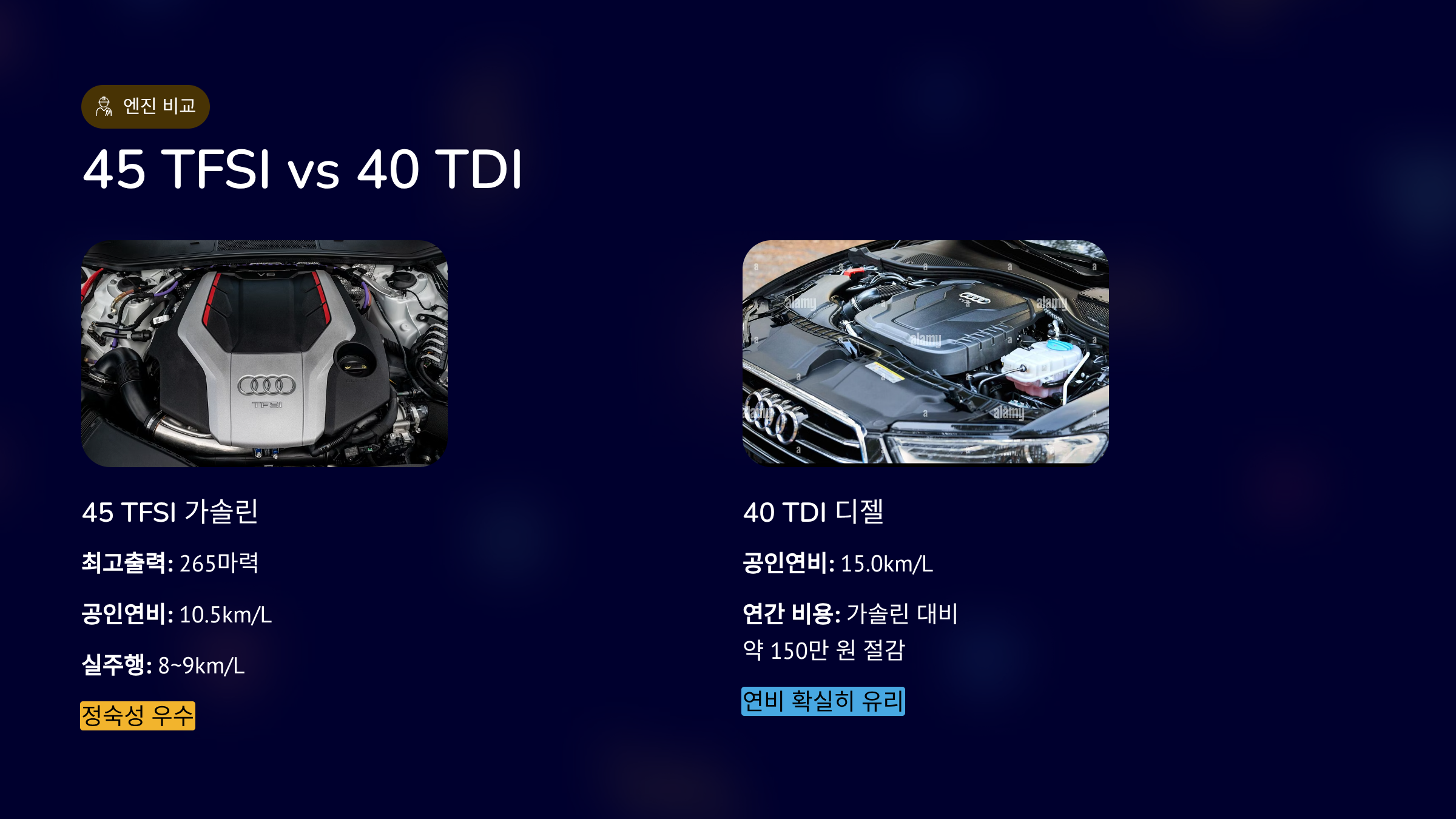 45 TFSI는 2.0 가솔린 터보입니다. 최고출력 265마력입니다. 공인연비는 10.5km/L입니다. 실주행은 8~9km/L 수준입니다. 40 TDI는 2.0 디젤입니다. 공인연비는 15.0km/L입니다. 연 2만km 기준 유지비 차이는 약 150만 원입니다. 후기에서는 정숙성은 가솔린이 낫다고 합니다. 연비는 디젤이 확실히 유리합니다.