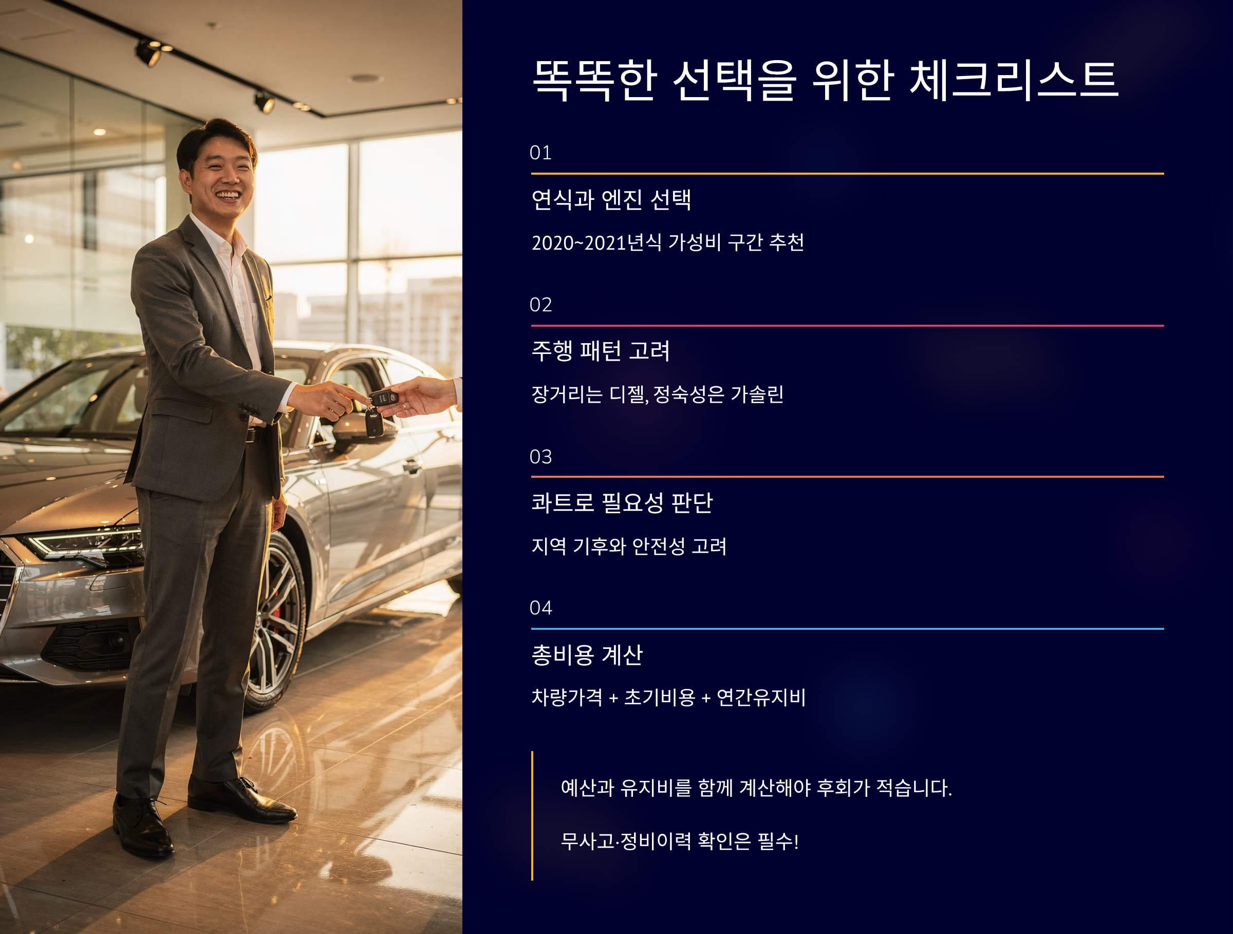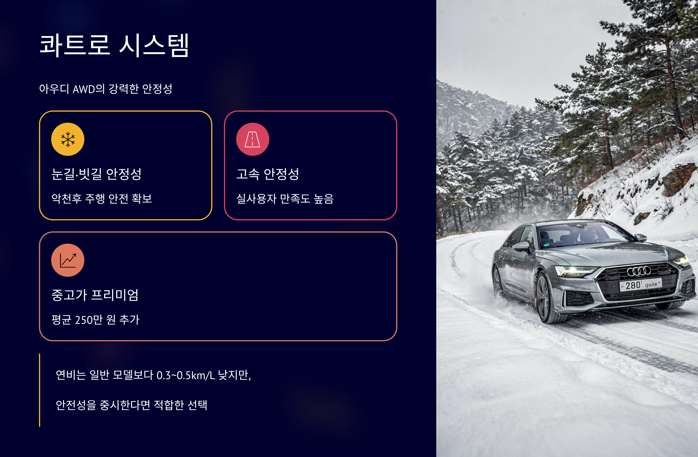 콰트로는 아우디 AWD 시스템입니다. 눈길·빗길 안정성이 강점입니다. 연비는 일반 모델보다 0.3~0.5km/L 낮습니다. 2021년 콰트로 평균 4,300만 원입니다. 보험료는 연 150만~180만 원입니다. 콰트로 옵션은 중고가에서 프리미엄이 붙습니다. 실사용 후기에서는 고속 안정성이 뛰어나다고 합니다. 주행 안전을 중시한다면 적합합니다.