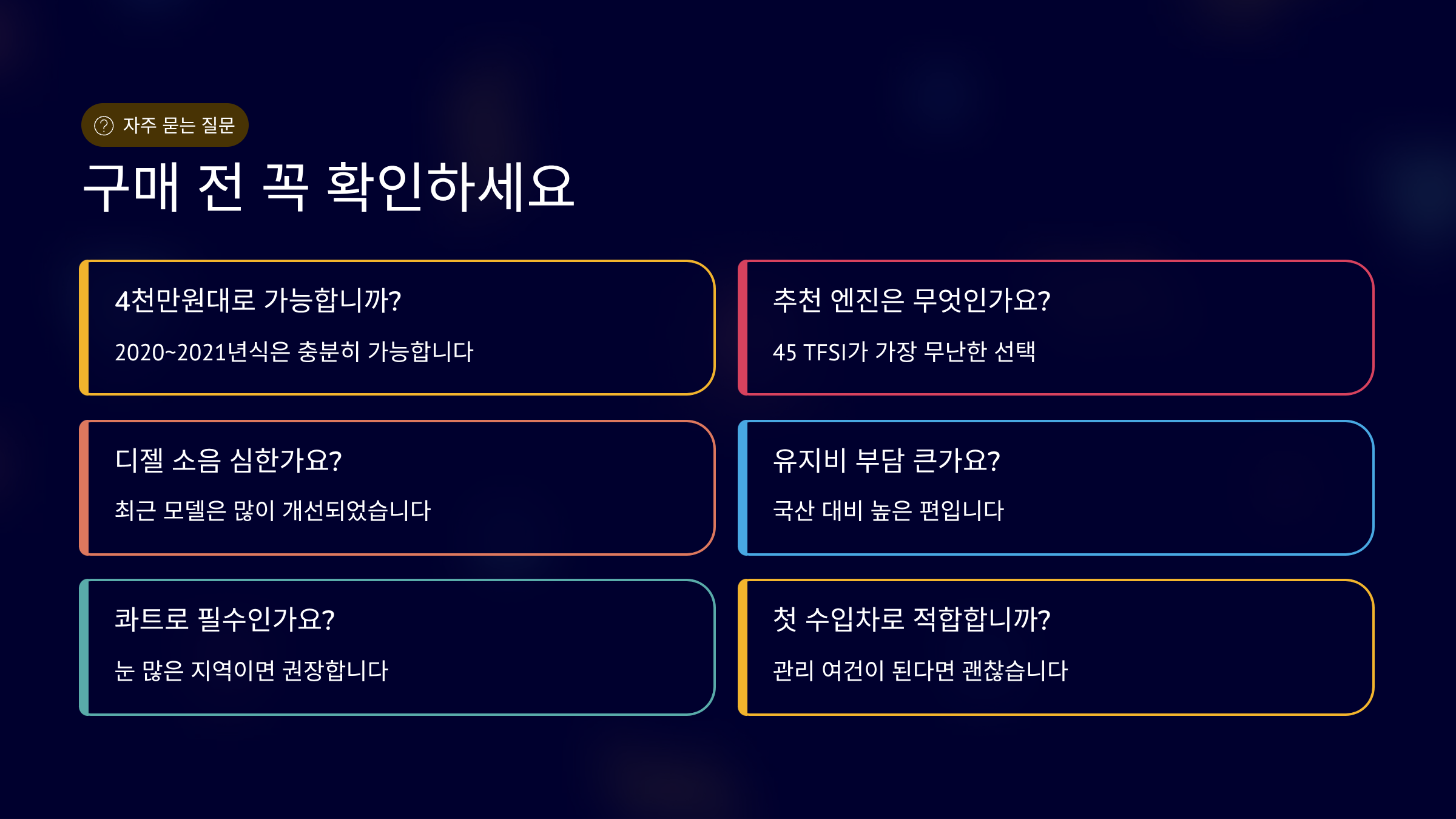 Q. 추천 엔진은 무엇인가요? A. 45 TFSI가 무난합니다.
