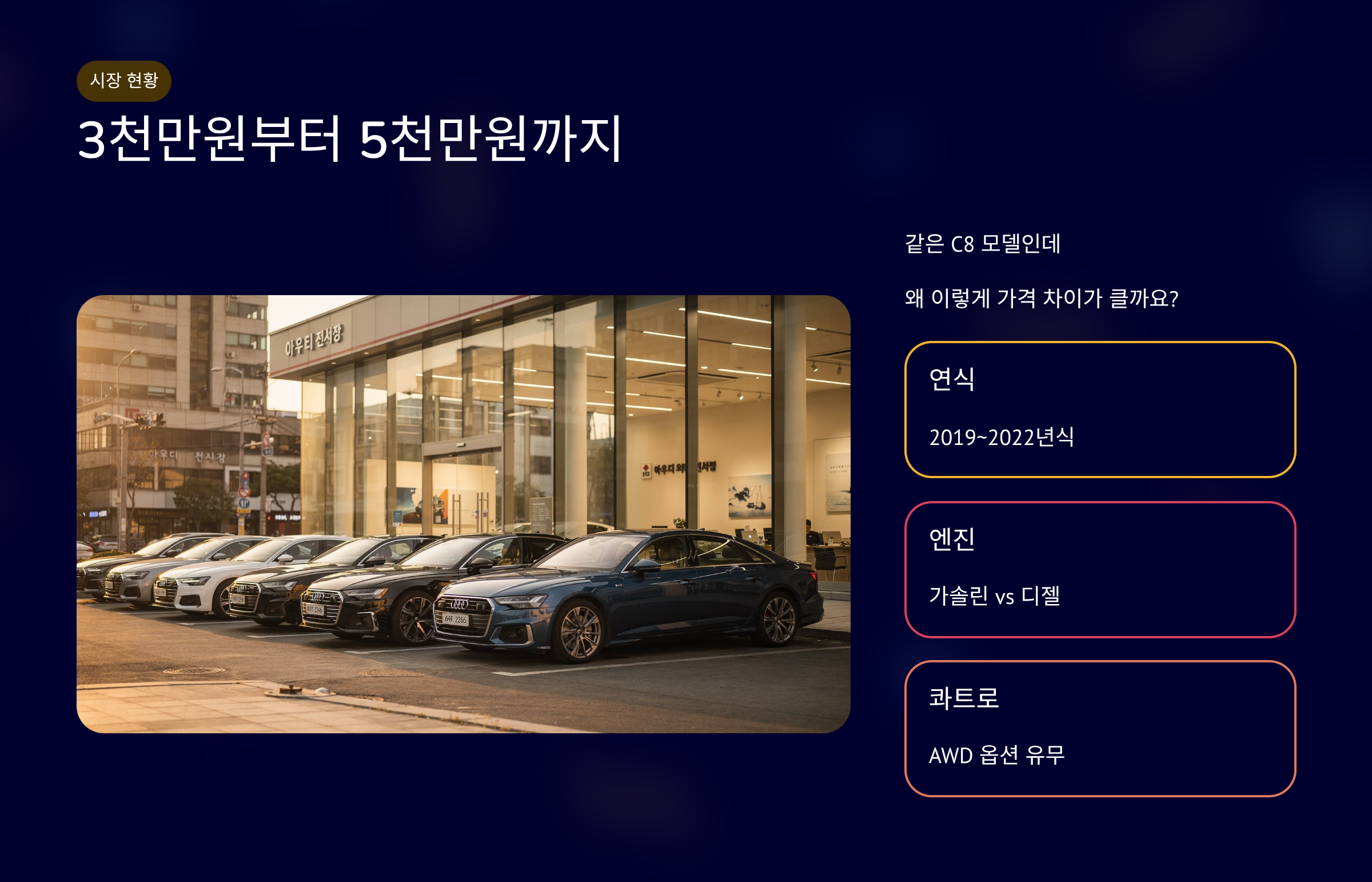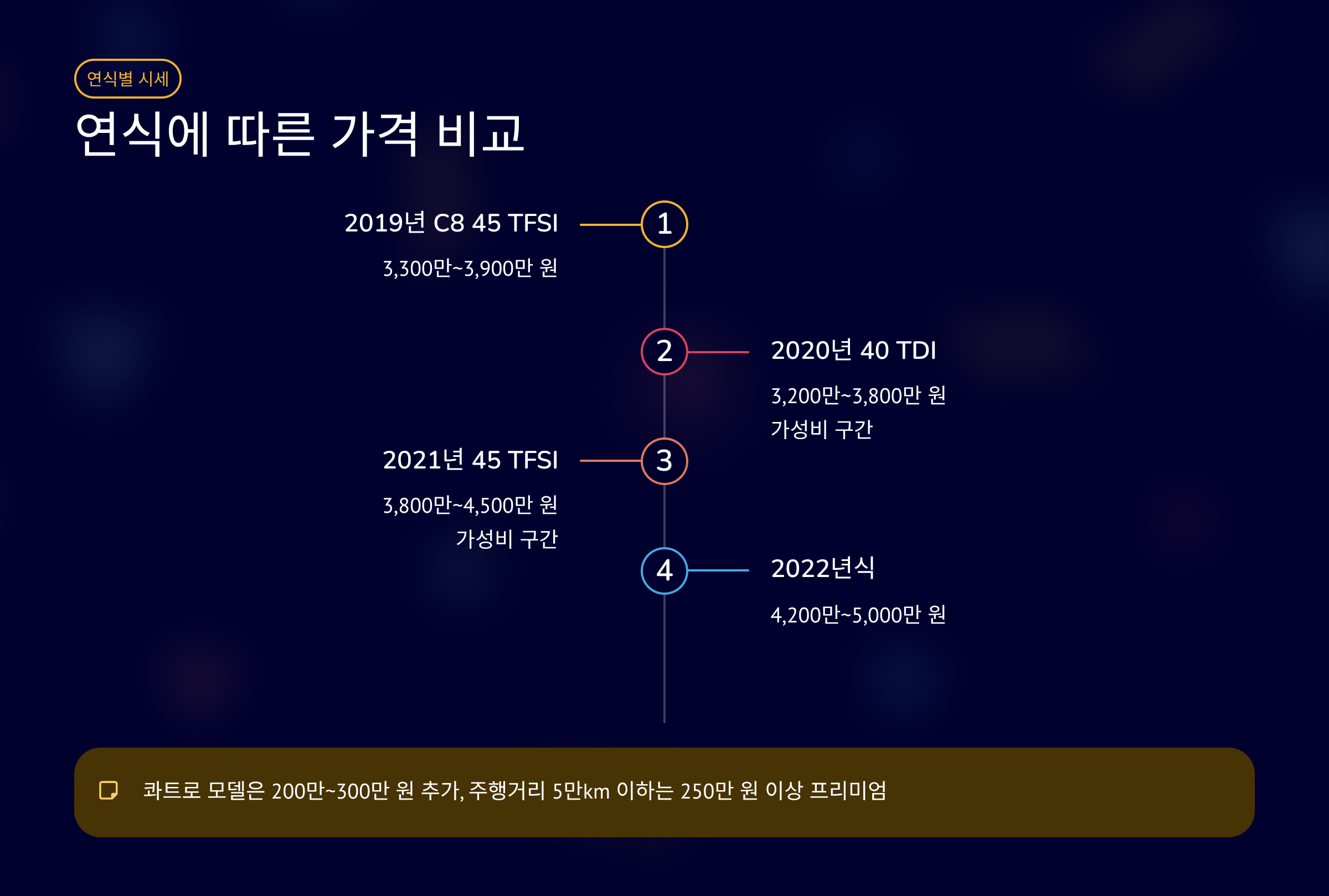 2019년 C8 45 TFSI는 3,300만~3,900만 원입니다. 2020년 40 TDI는 3,200만~3,800만 원입니다. 2021년 45 TFSI는 3,800만~4,500만 원입니다. 2022년식은 4,200만~5,000만 원입니다. 콰트로 모델은 200만~300만 원 높습니다. 주행거리 5만km 이하 차량은 250만 원 이상 높습니다. 실구매 후기에서는 2020~2021년식이 가성비 구간이라는 평가가 많습니다. 연식별 비교 시 전기형·후기형 구분도 중요합니다.