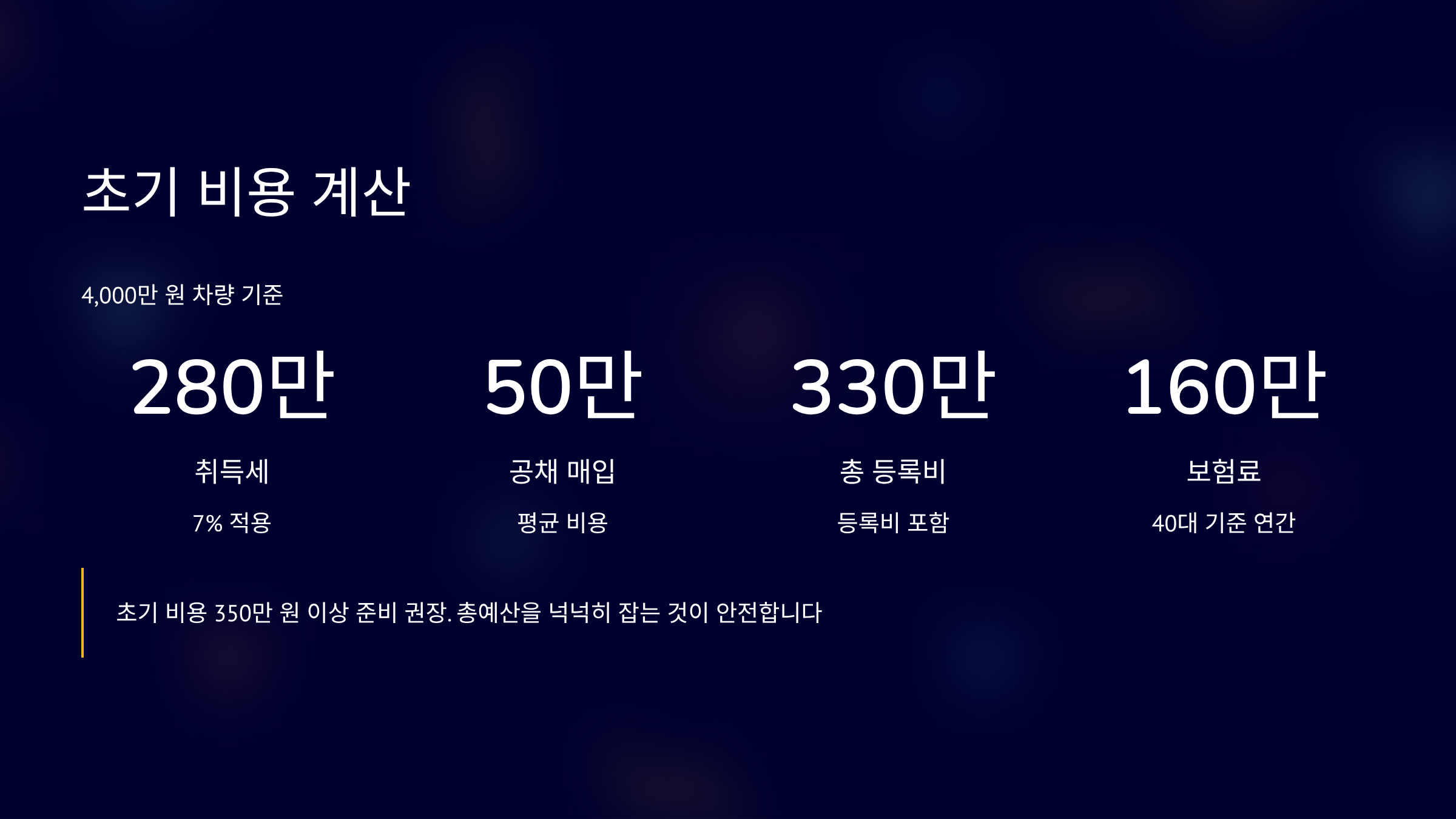 4,000만 원 차량 기준 계산합니다. 취득세 7% 적용 시 약 280만 원입니다. 공채 매입은 약 40만~60만 원입니다. 등록비 포함 약 330만 원 예상됩니다. 보험료는 40대 기준 연 160만 원 수준입니다. 초기 비용 350만 원 이상 준비하는 것이 안전합니다. 실구매 후기에서는 세금과 보험을 미리 계산하라고 조언합니다. 총예산을 넉넉히 잡는 것이 좋습니다.