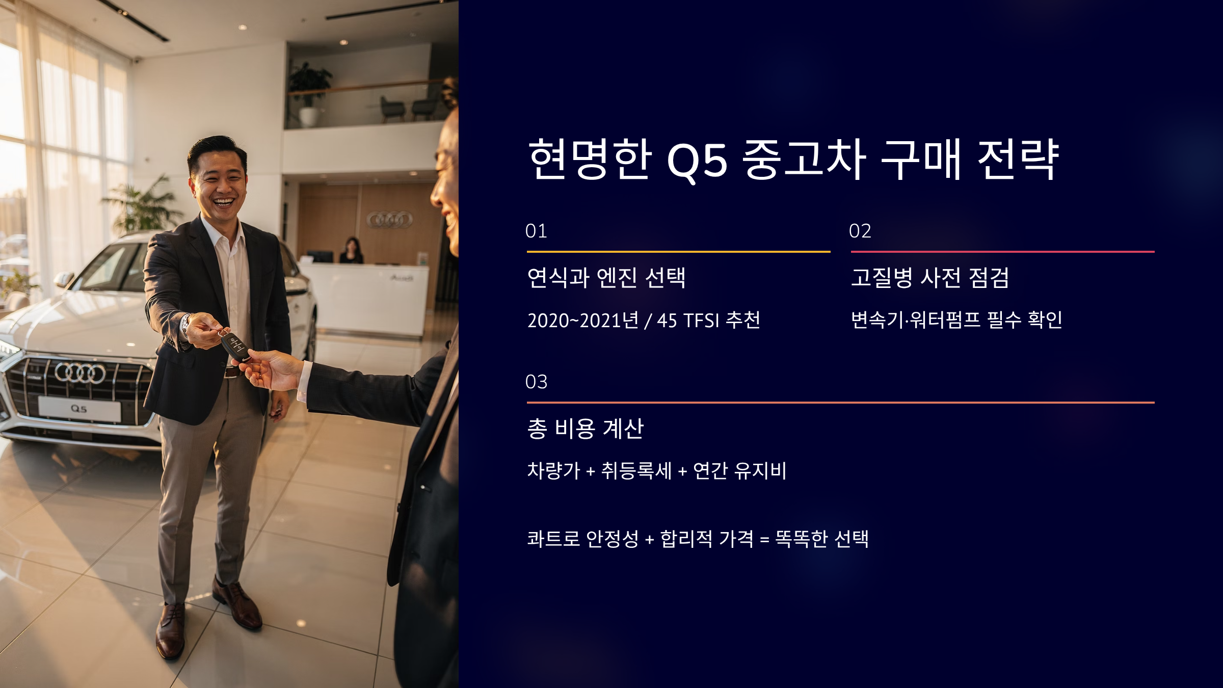 아우디 q5 중고차 가격은 연식과 엔진 선택이 핵심입니다. 45 TFSI는 출력과 정숙성이 장점입니다. 40 TDI는 연비가 강점입니다. 콰트로는 안정성이 뛰어납니다. 고질병 점검을 반드시 진행하시기 바랍니다. 연식·연비·세금까지 계산해 선택하는 것이 중요합니다.