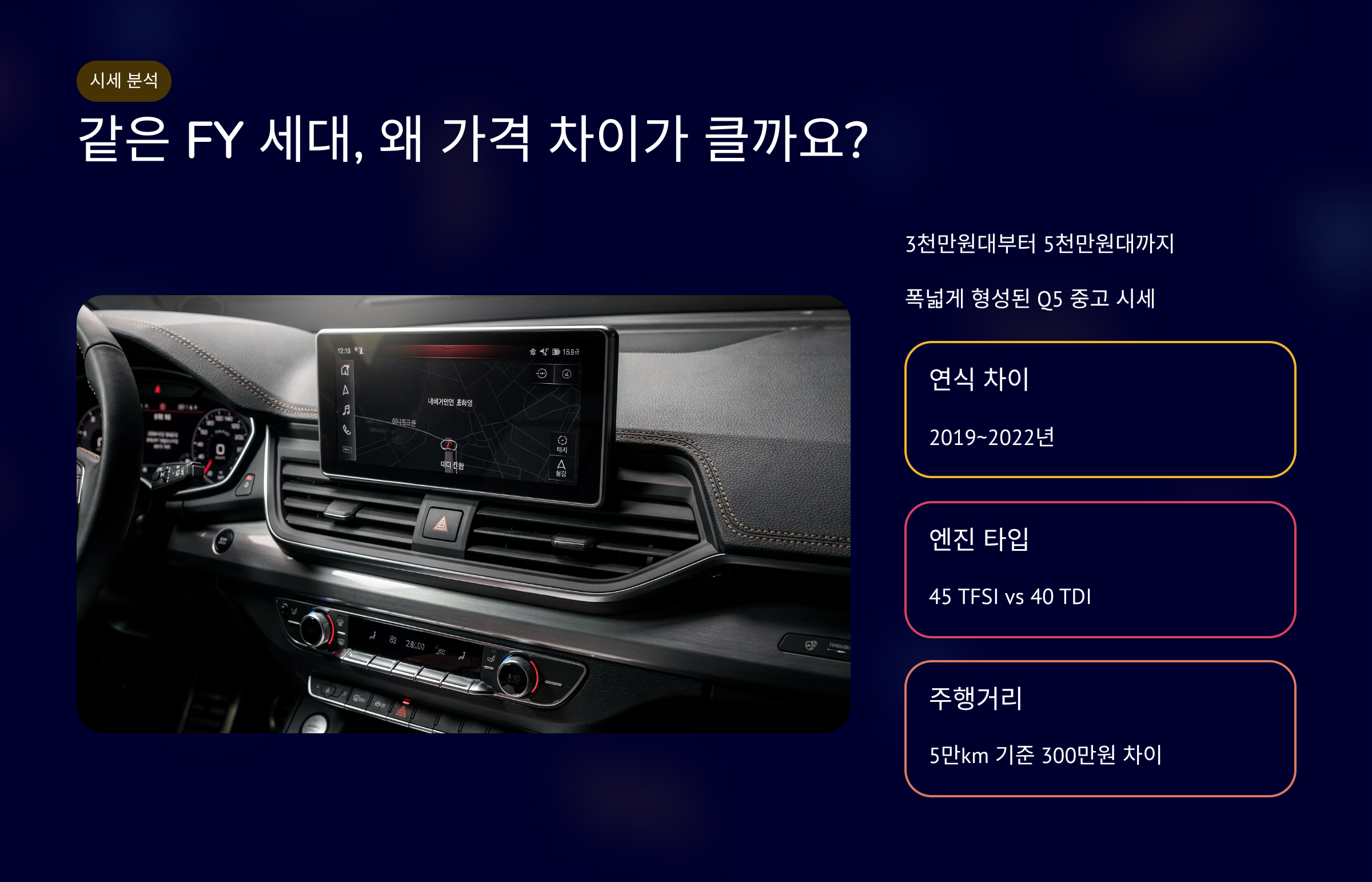 수입 중형 SUV를 고민하면 결국 Q5를 보게 됩니다. 그런데 중고 시세를 보면 3천만원 초반부터 5천만원까지 형성되어 있습니다. 같은 FY 세대인데 왜 이렇게 차이가 날까요. 2026년 현재는 연식과 45 TFSI, 40 TDI 차이에 따라 격차가 분명합니다. 아우디 q5 중고차 가격은 연식별 흐름을 먼저 보는 것이 중요합니다. 지금부터 종류별 연식, 연비, 가격 수치와 후기까지 구체적으로 정리해 드리겠습니다.