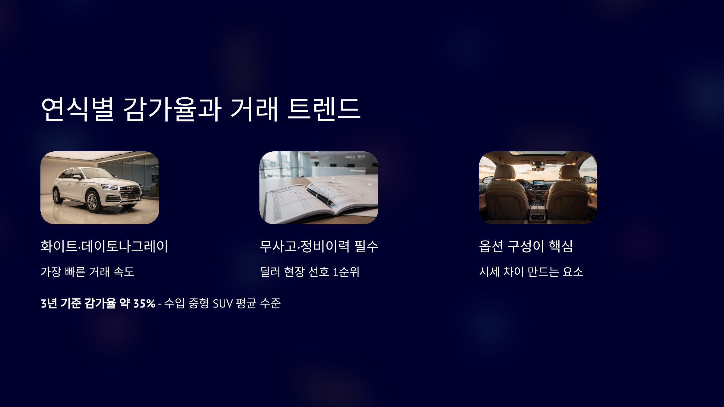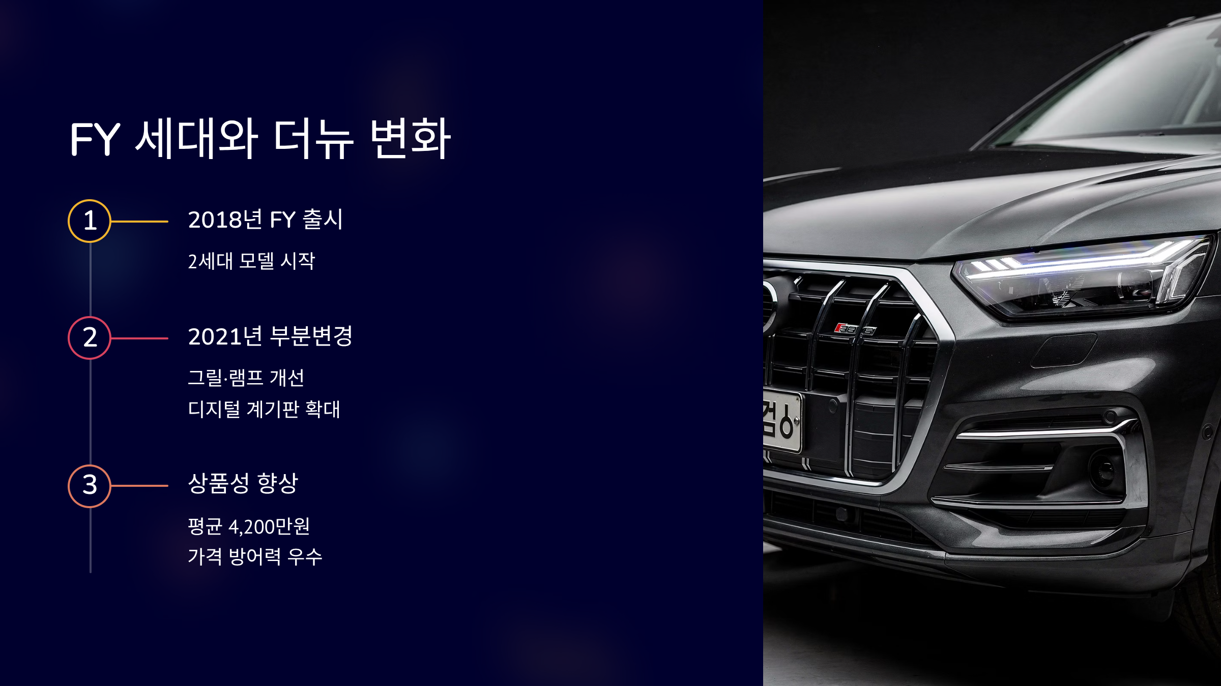 FY 감가율은 3년 기준 약 35% 수준입니다. 수입 중형 SUV 평균과 비슷합니다. 2020년 45 TFSI 평균 3,900만 원입니다. 2021년 40 TDI 평균 4,000만 원입니다. 2022년식 평균 4,600만 원입니다. 화이트·데이토나그레이 색상이 거래가 빠릅니다. 딜러 현장에서는 무사고·정비이력 보유 차량 선호가 높습니다. 옵션 구성 차이가 시세에 영향을 줍니다.