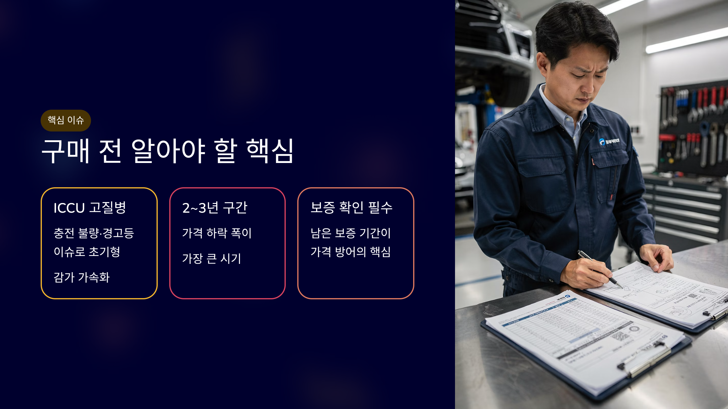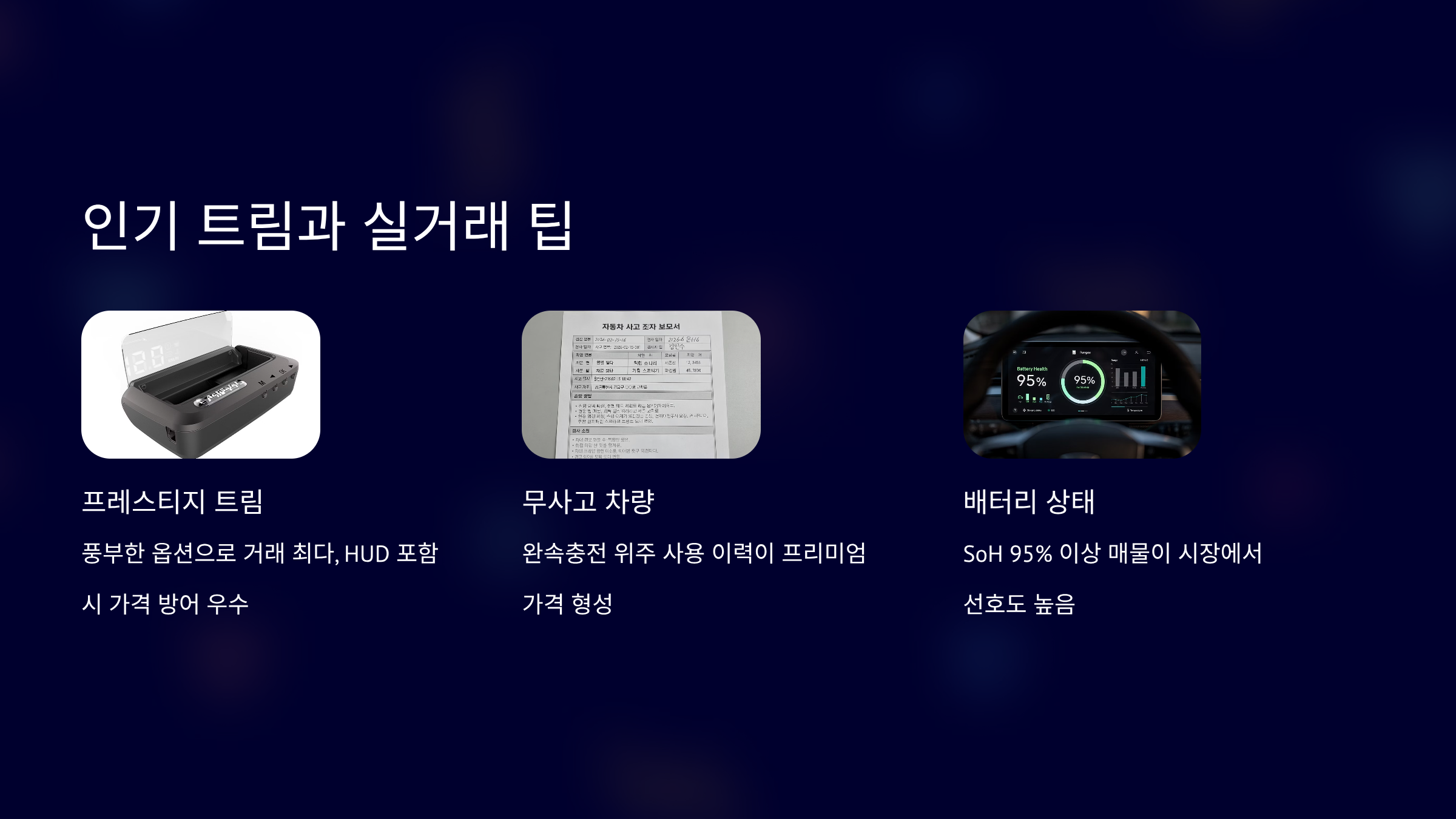 배터리 SoH 95% 이상 매물이 선호됩니다.